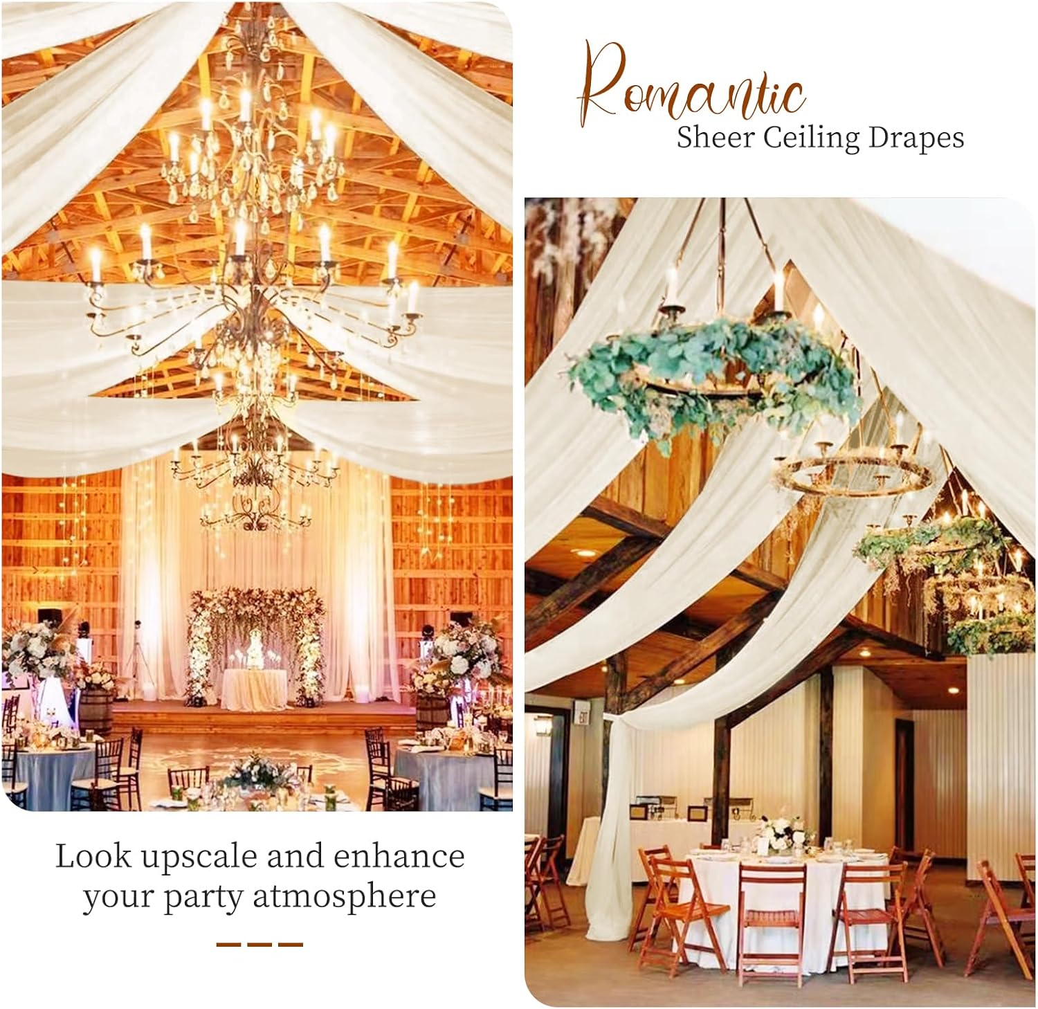 • 🍸Chiffon Ceiling Drapes: The package include 6 panels ivory wedding ceiling drapes (without hanging pieces). Each wedding extra long curtain measure for 5 feet width x 20 feet length. The sufficient quantity can meet your demands for decorating your weddings, parties, receptions. It will help to create a delicate and aesthetic sense to your wedding ceiling decoration.