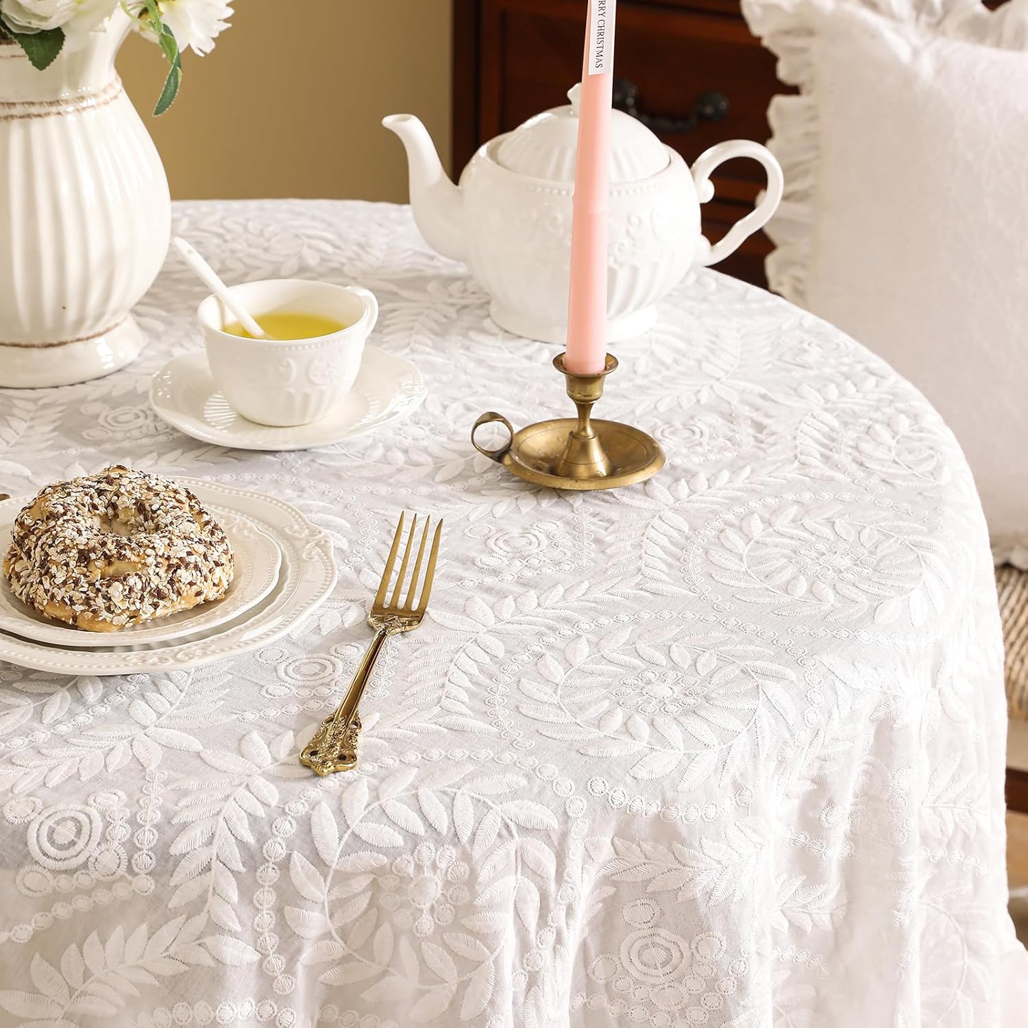 patdrea Vintage Ruffle Tablecloth for Round Tables,Farmhouse Embroidered Cotton White Lace Table Cloth Cover Decor for Dining Room Wedding Banquet Thanksgiving Christmas,Dimaeter 67"
