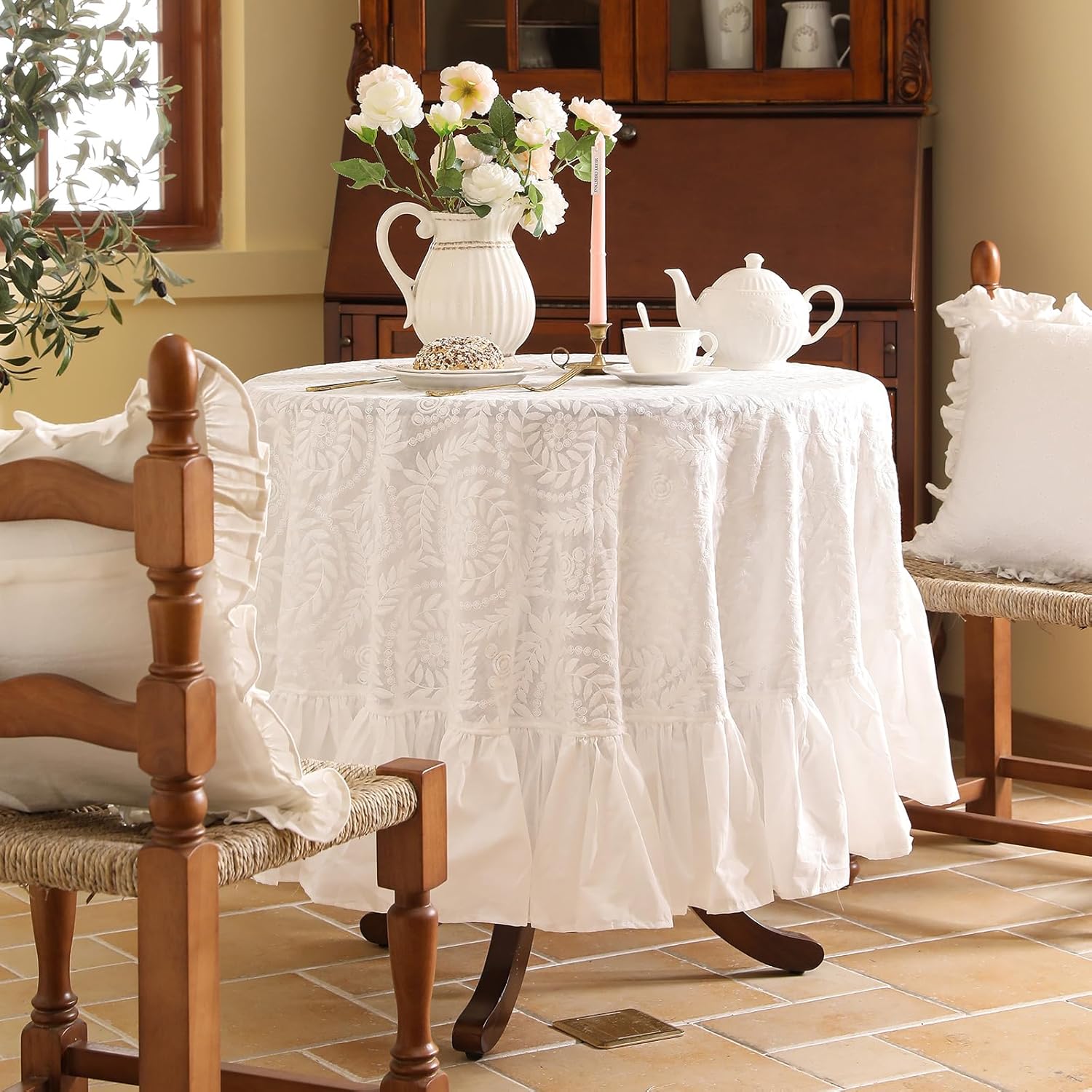 patdrea Vintage Ruffle Tablecloth for Round Tables,Farmhouse Embroidered Cotton White Lace Table Cloth Cover Decor for Dining Room Wedding Banquet Thanksgiving Christmas,Dimaeter 59"