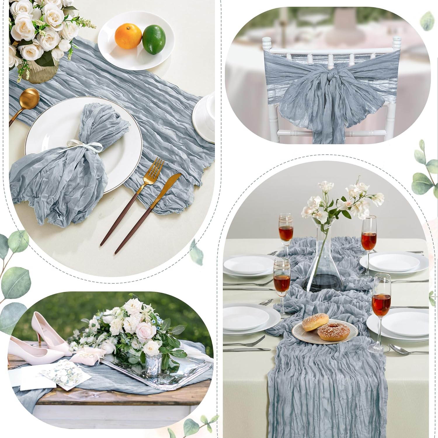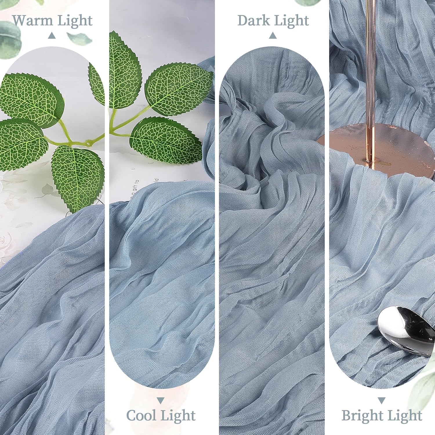• PACKAGE INCLUDED: You will receive 24 pieces of dusty blue cheesecloth table runners. Elegant and beautiful design, exquisite workmanship. Product size: Each boho table runner is 35 x 120 inches. Enough to cover rectangles and round tables, as well as long tables that are stitched together. It can even be used to belt chairs decorate napkins, background curtains. Round or square tables for 8-10 people, perfect for romantic and elegant party events