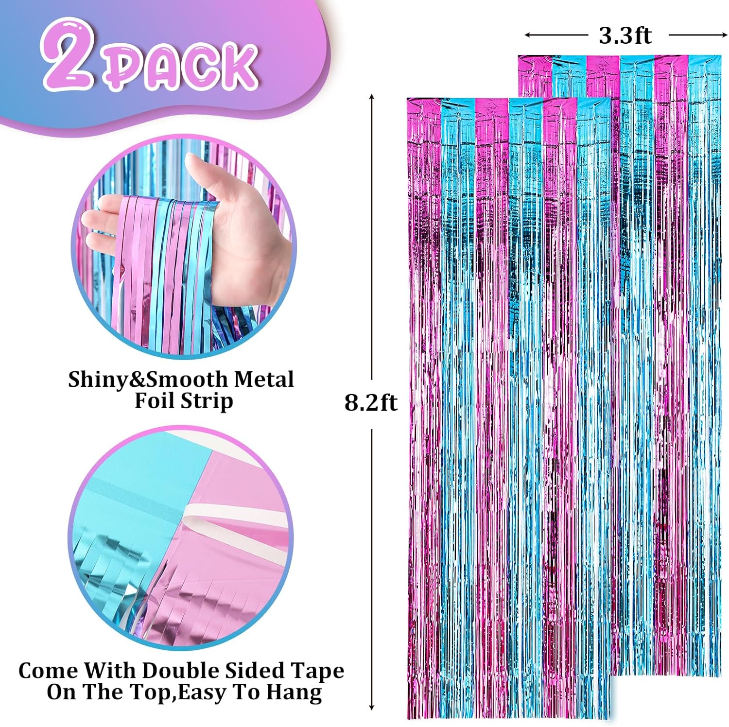 2 Pack 3.3x8.2 Feet Blue and Pink Foil Fringe Backdrop Curtains, Tinsel Streamers Birthday Party Decorations, Fringe Backdrop for Graduation, Baby Shower, Gender Reveal, Disco Party