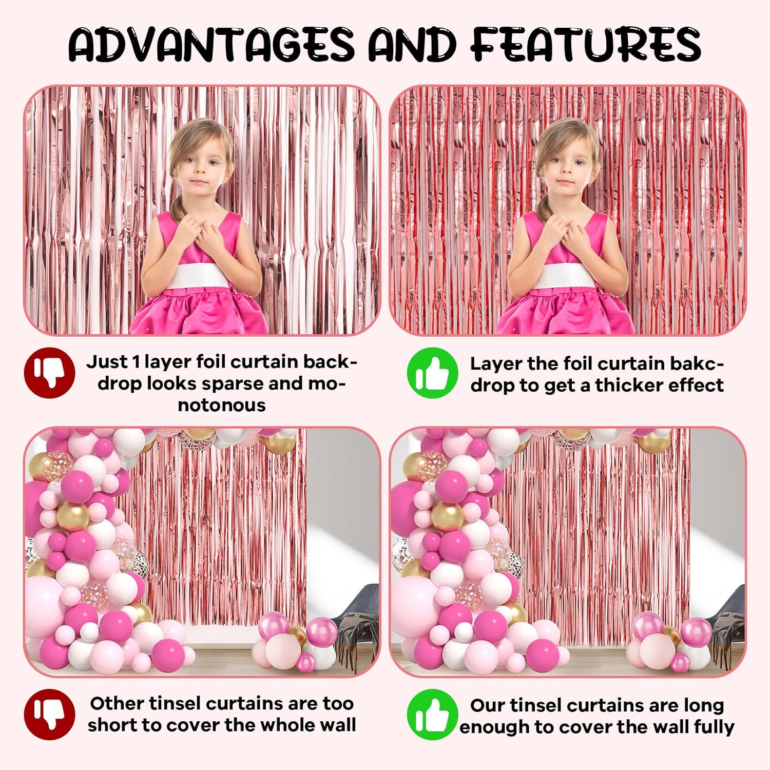2 Pack Rose Gold Foil Fringe Backdrop Curtains, Tinsel Streamers Birthday Party Decorations, Fringe Backdrop for Graduation, Baby Shower, Gender Reveal, Disco Party