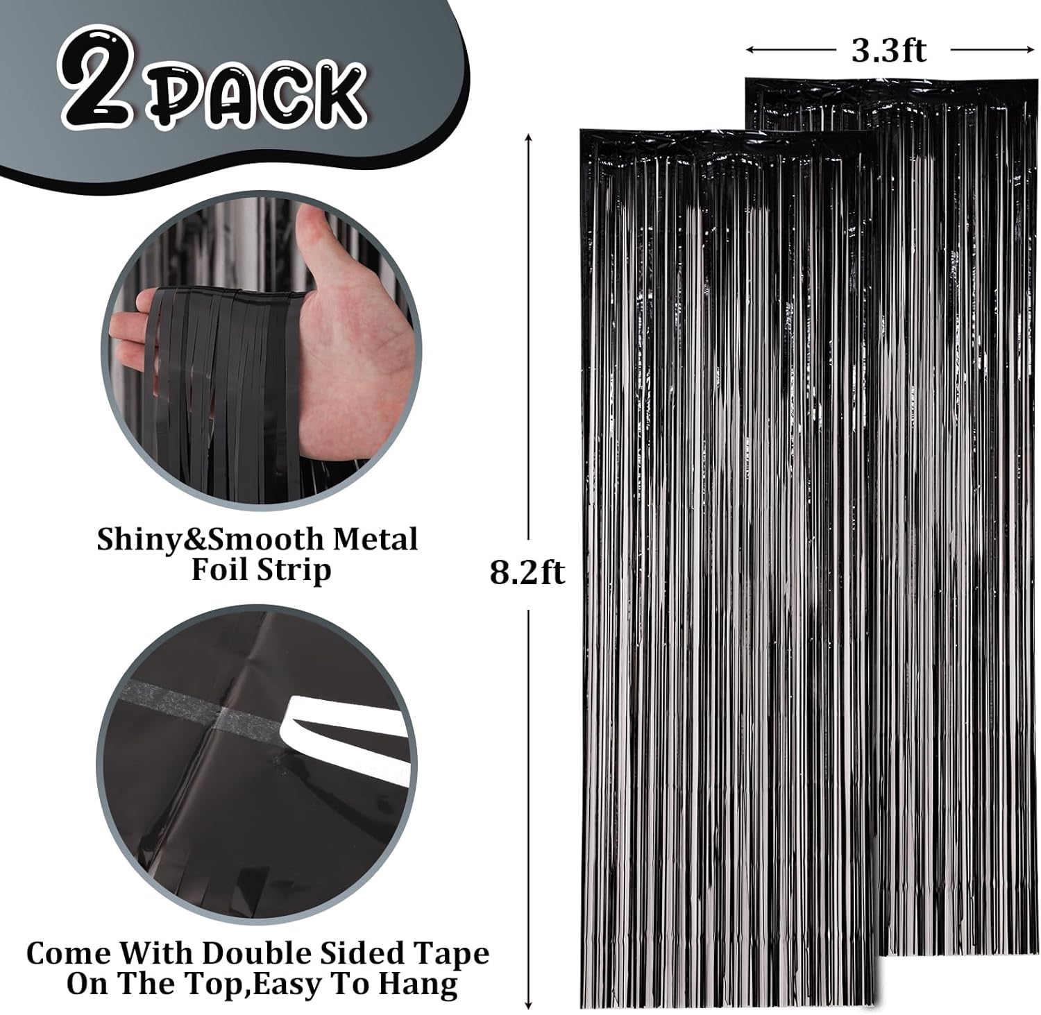 2 Pack Black Foil Fringe Backdrop Curtains, Tinsel Streamers Birthday Party Decorations, Fringe Backdrop for Graduation, Baby Shower, Gender Reveal, Disco Party