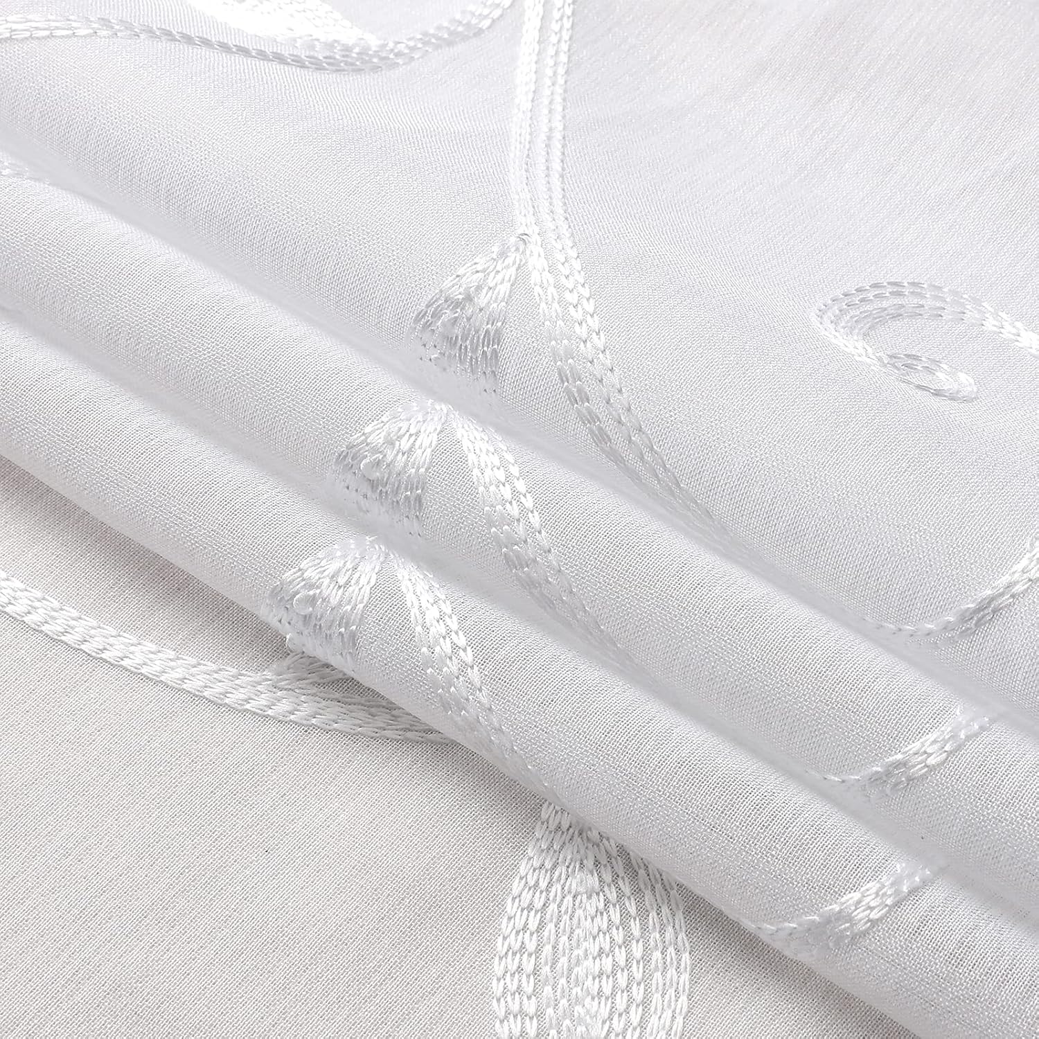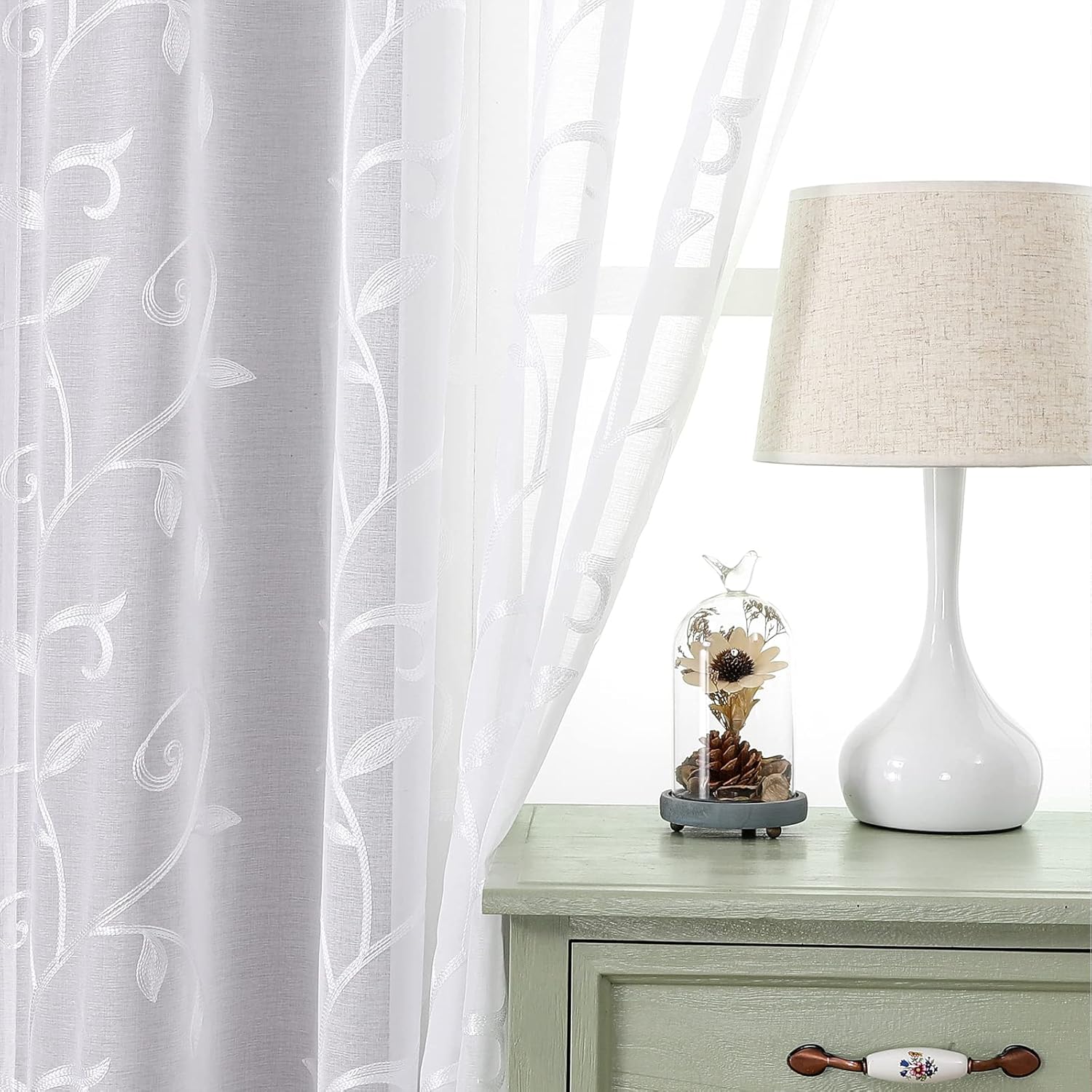 VISIONTEX White Sheer Voile Curtains, Decorative Leaves Embroidery Faux Linen Rod Pocket Window Drapes for Home Kitchen, Living Room and Bedroom 26 x 36 Inch, Set of 2 Curtain Panels