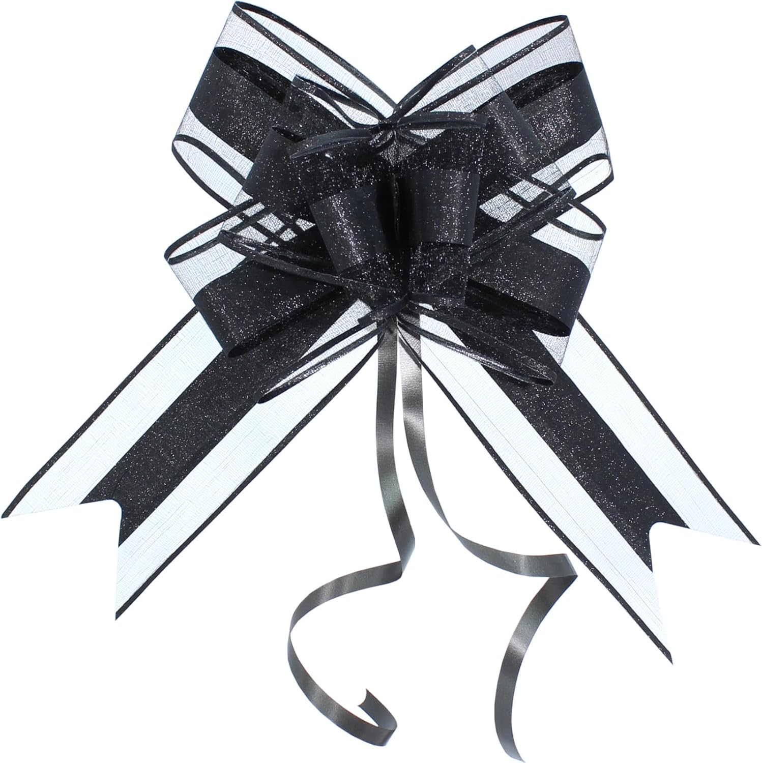 • Package: Each package include 10 large black bows, and their assembled diameter is 8 inch. Our gift wrap bows are made of high quality pearlized glitter material. It will shining under the light and look elegant and glamorous