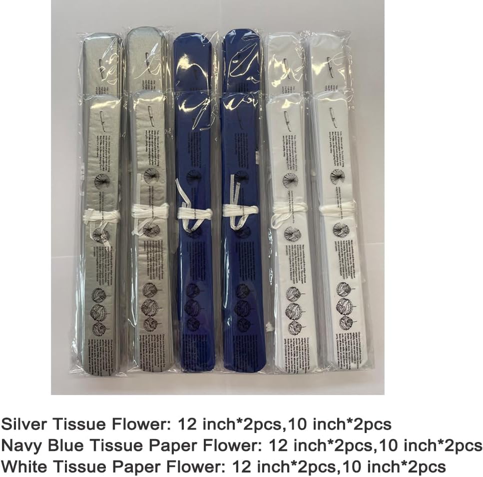 • Tissue Paper Flower Royal Blue and Silver 12pc in 2 sizes,package include silver crafts flower 4pc (2pc in 12'' and 2pc in 10''), royal blue crafts flower 4pc(2pc in 12'' and 2pc in 10''), white crafts flower 4pc(2pc in 12'' and 2pc in 10'')