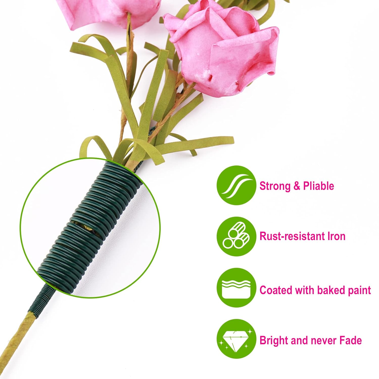 • Good Toughness: The green wire easily conforms to needed shapes and can be easily wound around even the most complex stems. It is strong but Pliable. No matter how you twist the wire, it will not burst.
