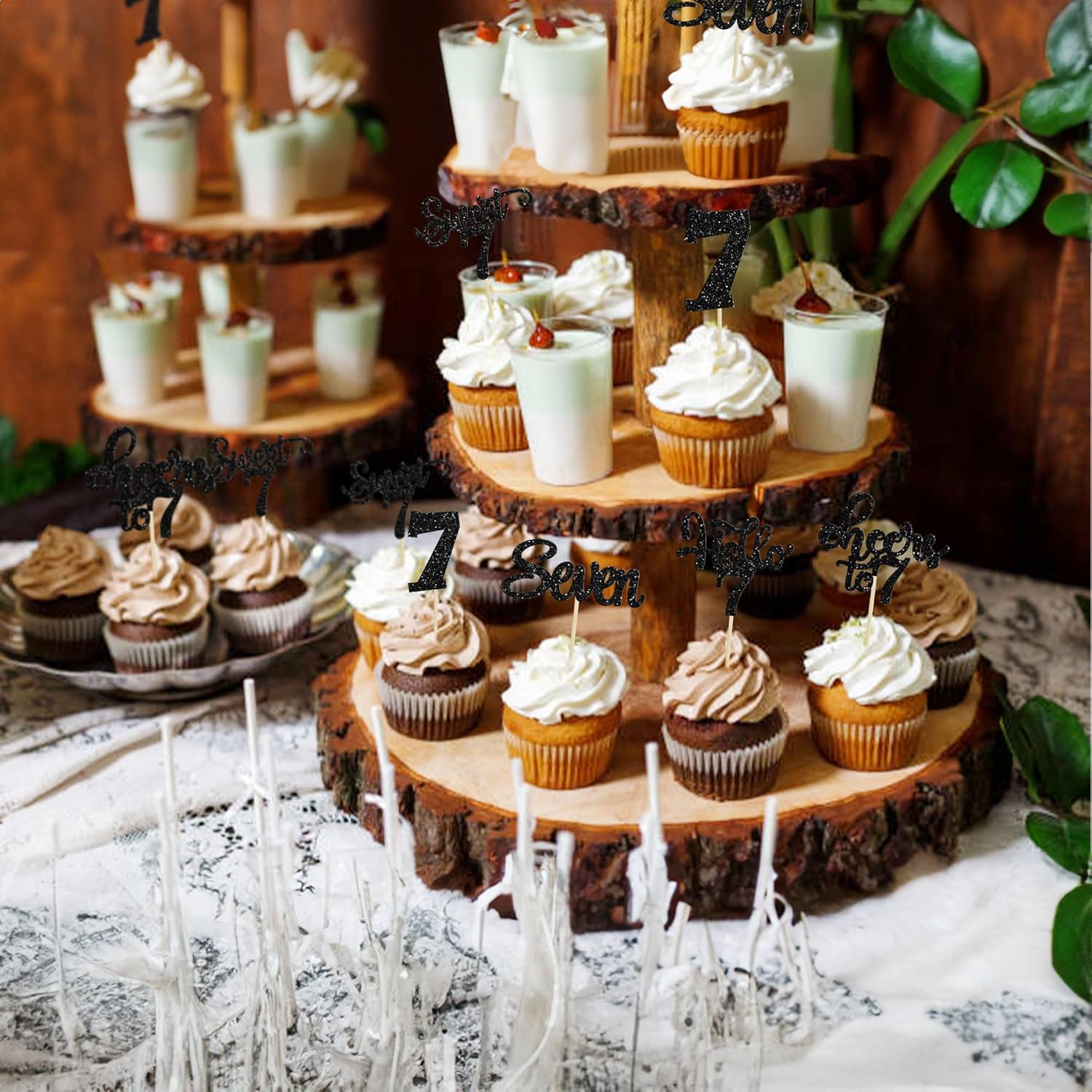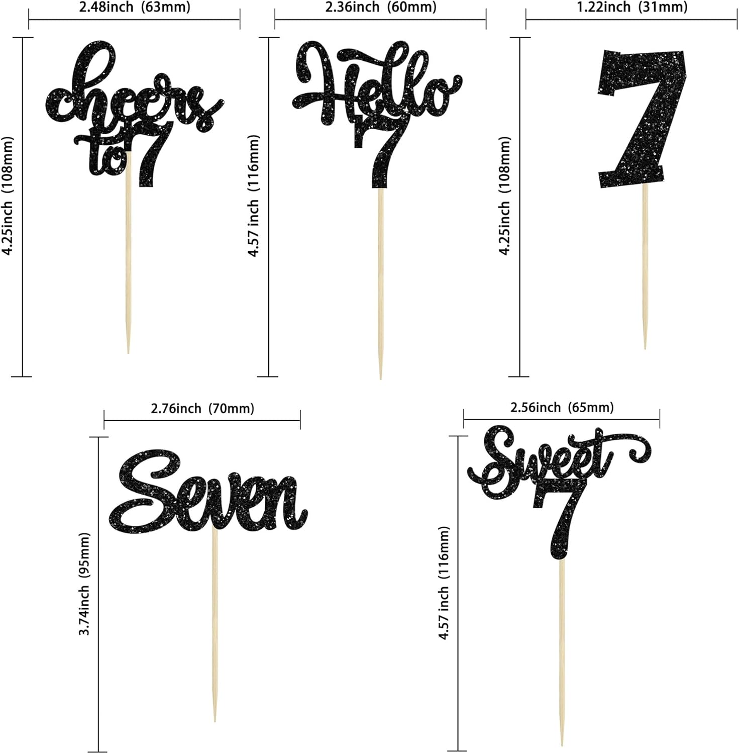 30Pcs 7th Birthday Cupcake Toppers Glitter Seven Happy 7 Cupcake Picks Cheers to 7 Years Old Cake Decorations for 7th Birthday Party Supplies Black