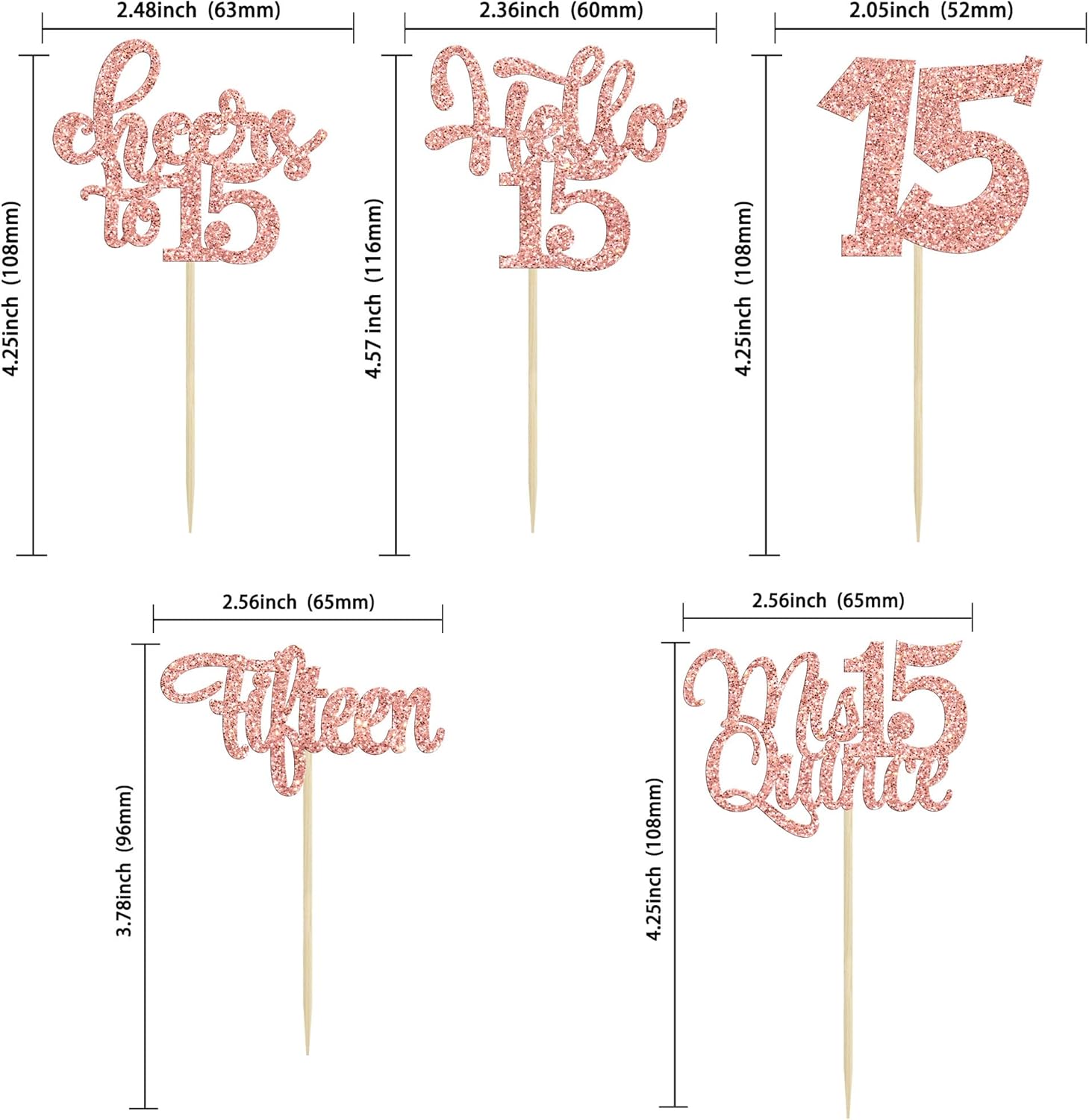 30Pcs 15th Birthday Cupcake Toppers Fifteen Cupcake Picks Cheers to 15 Years Old Mis Quince 15 Cake Decorations for 15th Birthday Anniversary Party Rose Gold Glitter