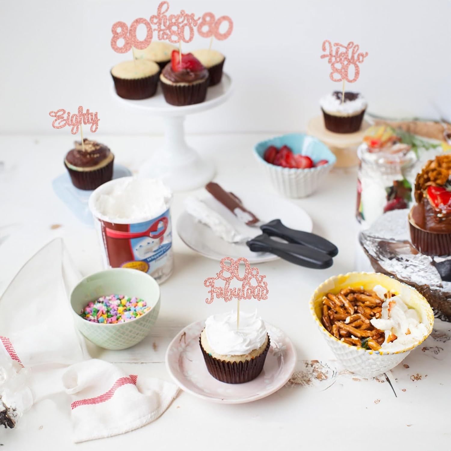 30Pcs Happy 80th Birthday Cupcake Toppers Eighty Cheers to 80 Years Old Birthday Cupcake Picks for Happy 80th Birthday Anniversary Party Cake Decorations Rose Gold Glitter