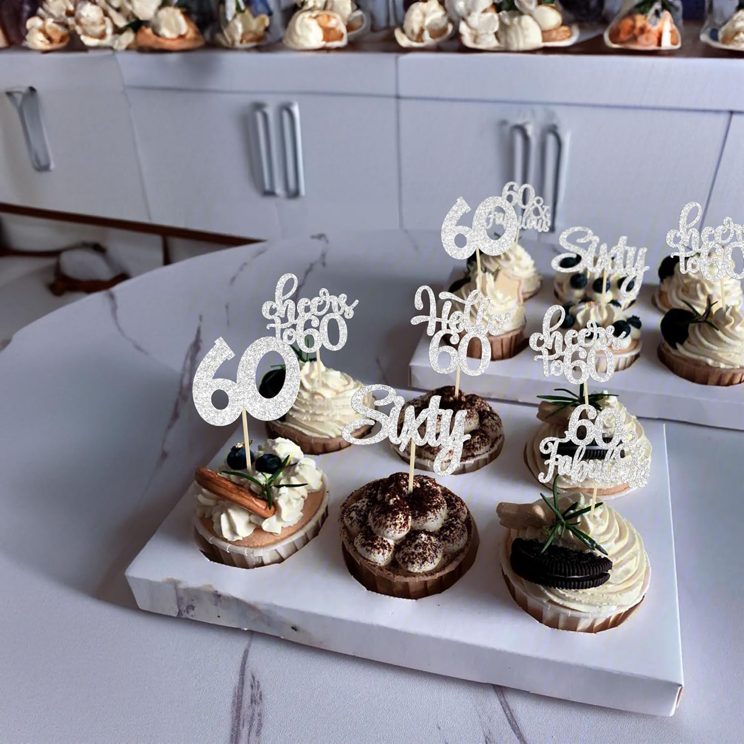 30Pcs Happy 60th Birthday Cupcake Toppers Silver Glitter Sixty Cake Toppers Cheers to 60 Years Old Birthday Cupcake Picks for 60th Birthday Anniversary Party Cake Decorations Supplies