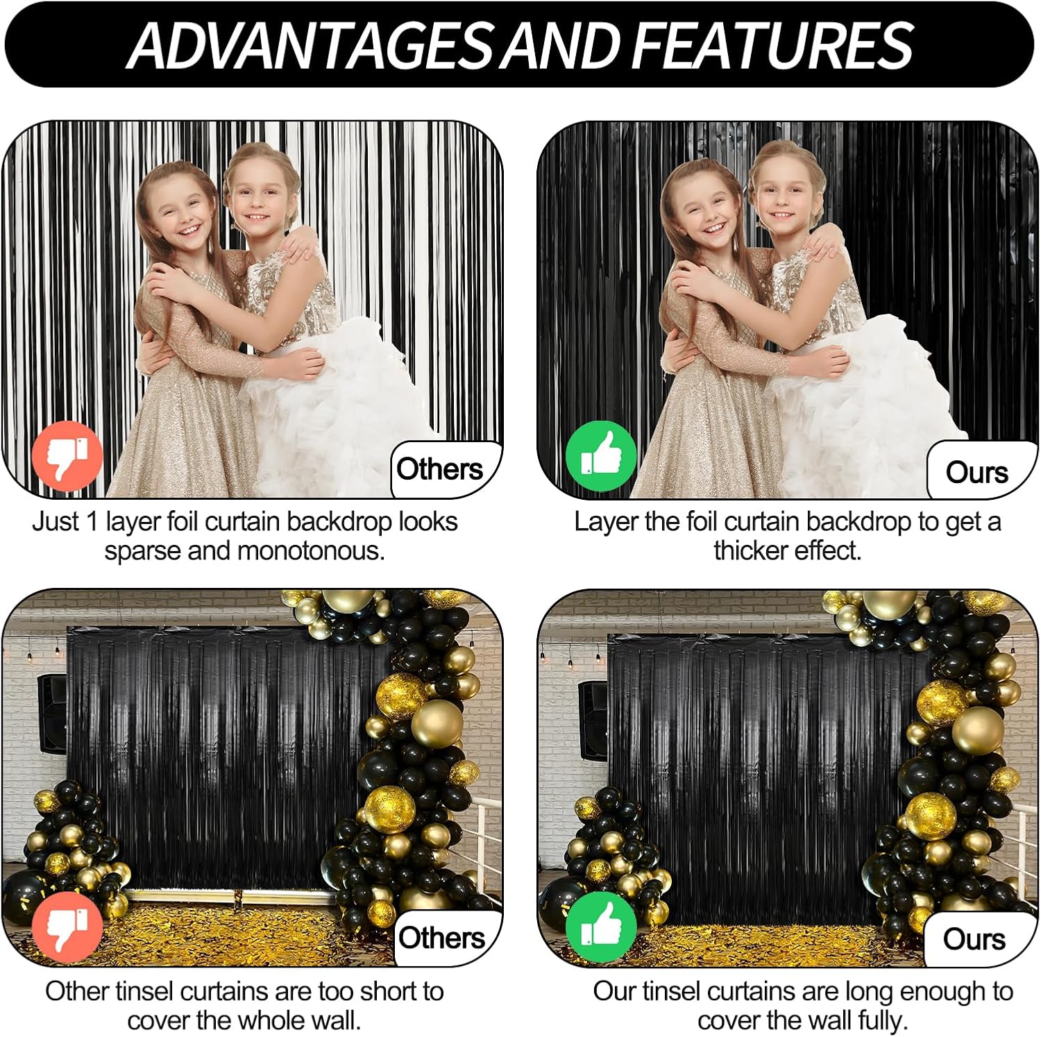 • Easy to Use - The foil curtain backdrop comes with double sided tape on the top, peel plastic strip off and it would be very easy to paste on smooth surfaces such as wall, window, table, door or anywhere you like. You can cut the foil curtain with scissors into the suitable Length, assemble the party streamers side by side to make the backdrop larger, or layer the backdrop curtains to get a thicker effect.