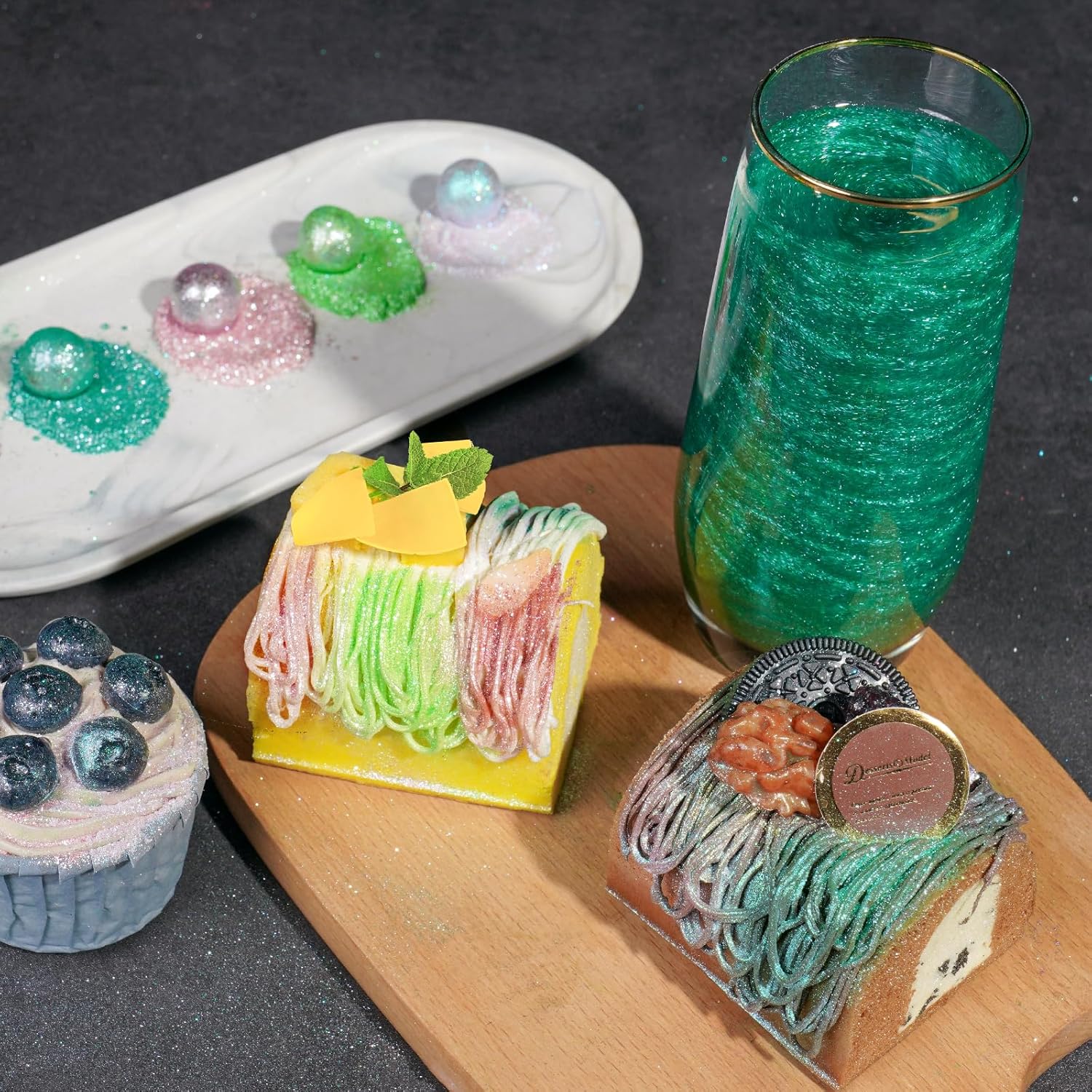 • 🌟【Easy to Use】Specially developed for food decoration and craft industries, this luster dust produces realistic looks by highly pigmented colors with a metallic finish. The pretty fine grain is more convenient for painting. To add glimmer and sparkle to your creations, simply sprinkle or dry brush the luster glitters on them. This product adheres very well to both wet and dry mediums. Attention: Seal and store glitter powder in a cool and dry place after use. Do not expose to excessive heat.