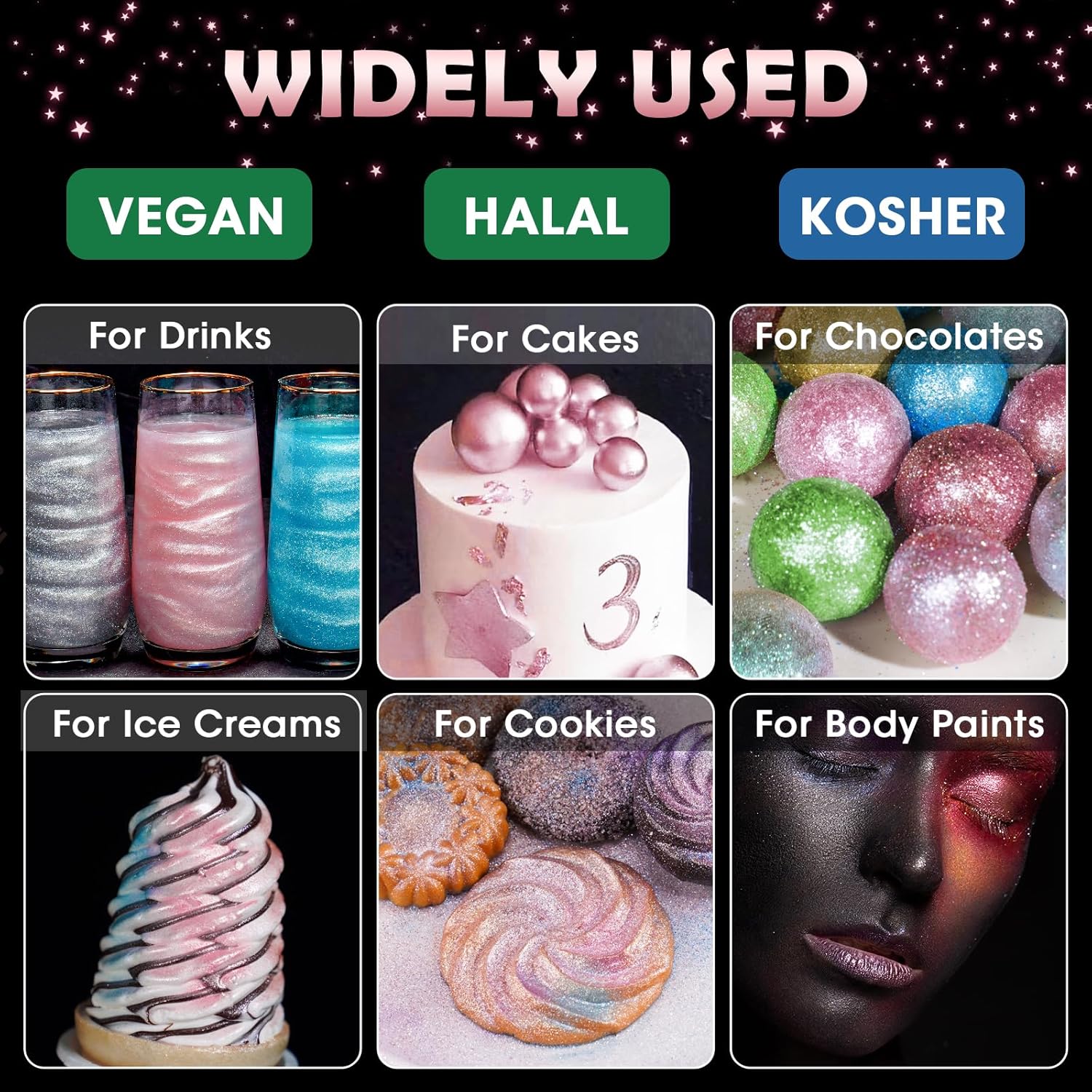 • 🌟【Vegan & Allergen-Free】Food-grade glitter uses only the highest quality vegan ingredients and does not contain common food allergens, including gluten, nuts or dairy products, so everyone can use and enjoy this product regardless of diet or food allergies. Unlike food contact glitter, these are 100% edible, so you don't need to worry about using them in your creations to make them sparkle for all.