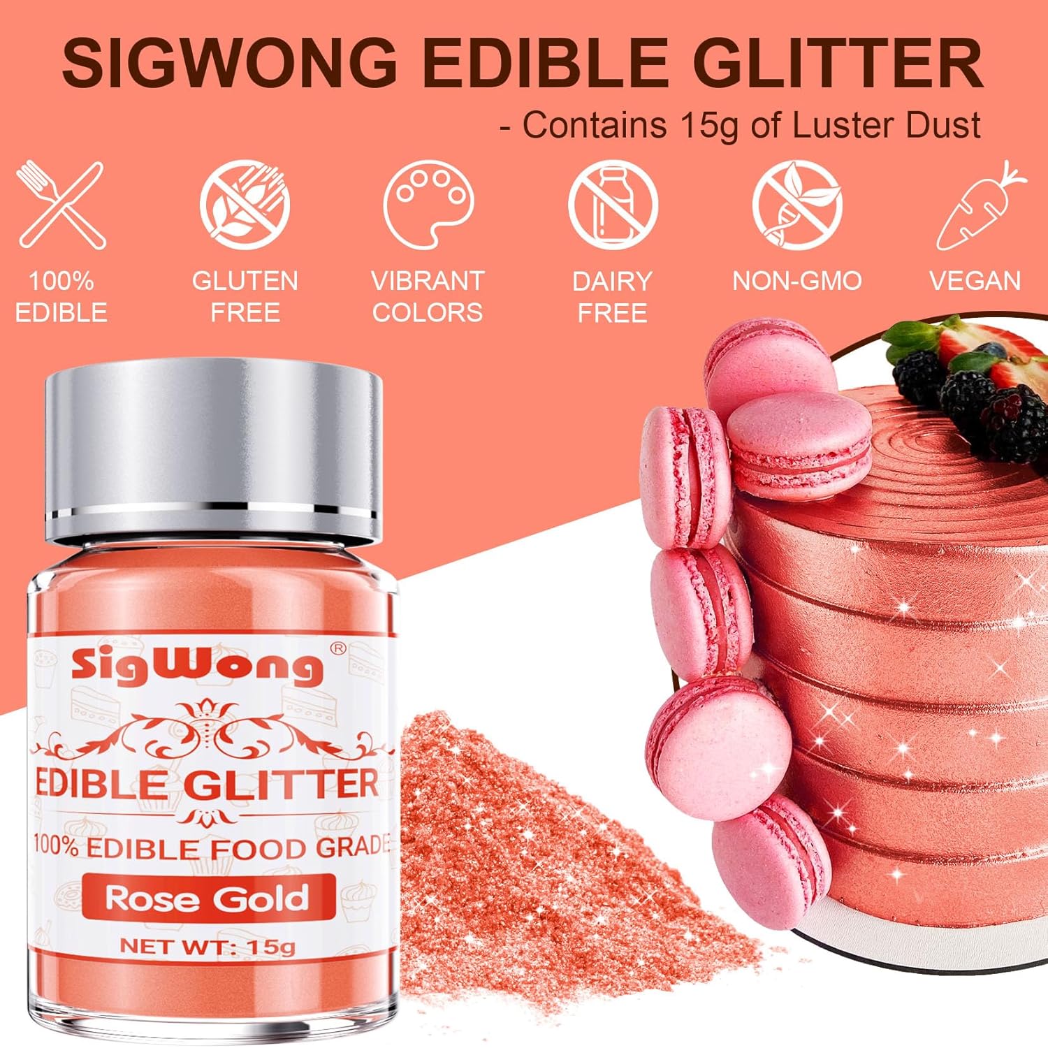 Rose Gold Edible Glitter - 15g Food Grade Luster Dust Powder, Cake Decorating Sprinkle Glimmery Dust for Drinks, Wine, Fondant, Chocolate, Candy, Cookie, Vegan