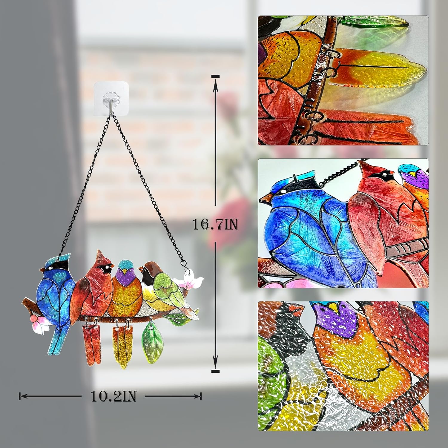 • High Quality Stained Glass:The suncatcher is skilled handmade by stained glass sheet. Clear, hand-painted feather textures on stained glass birds bring this sun catcher to make vivid. When the wind blows the bird, the cardinal bird's tail sways slightly and makes a beautiful sound.
