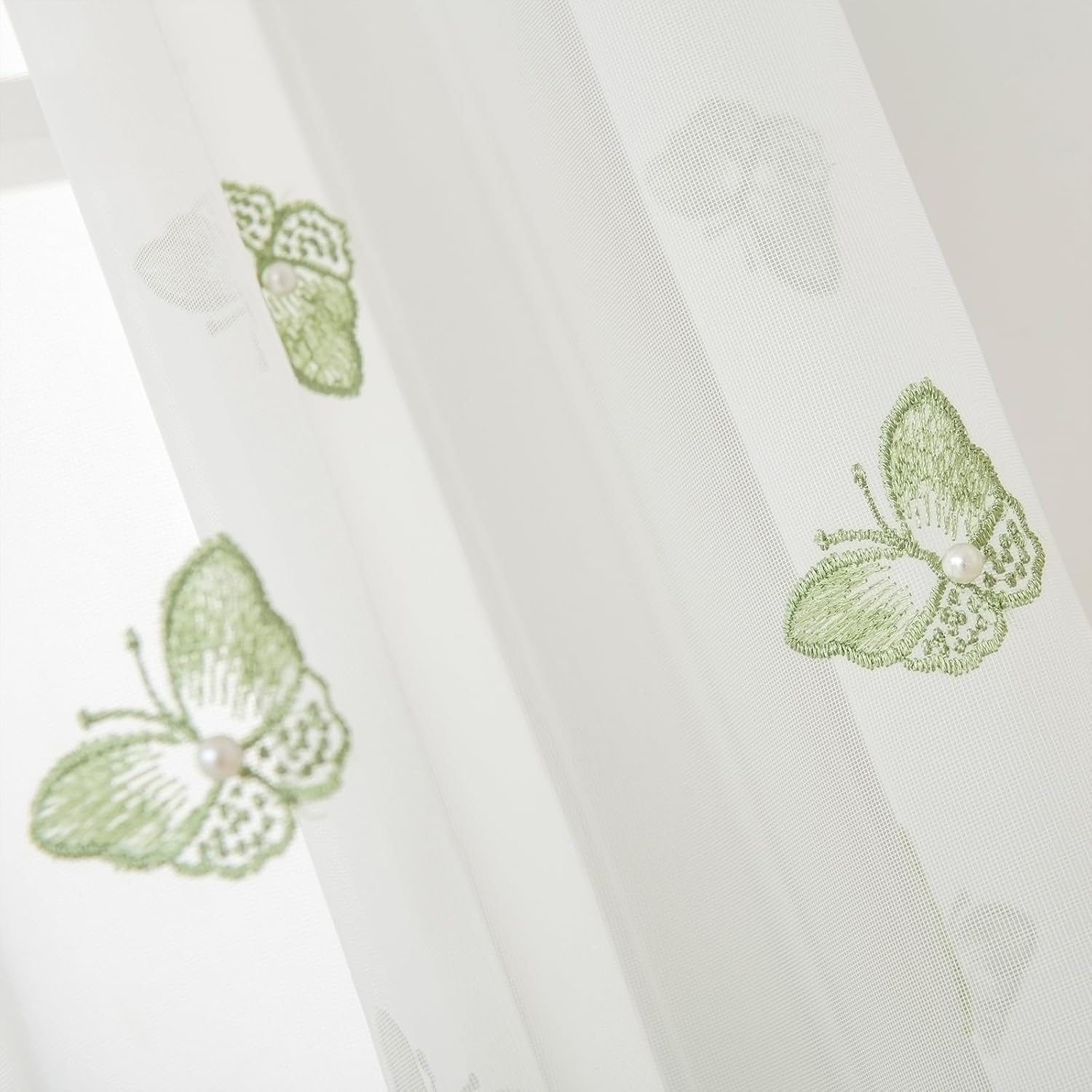 VISIONTEX White Sheer Voile Curtains, Decorative Green Embossed Butterflies Rod Pocket Window Drapes for Home Kitchen, Living Room and Bedroom 54 x 95 Inch, Set of 2 Curtain Panels