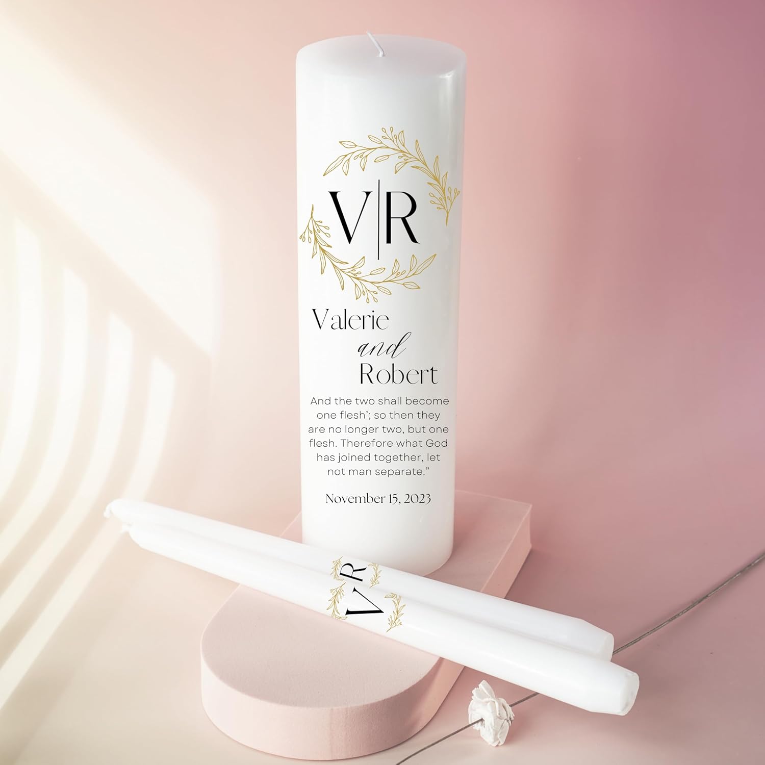 Unity Candles for Wedding, Modern Unity Set, Custom and Personalized Pillar and Taper Candles with Bible Quote, Unscented White Premium Wax, Religious and Wedding Ceremony, Special Events (Laurel)