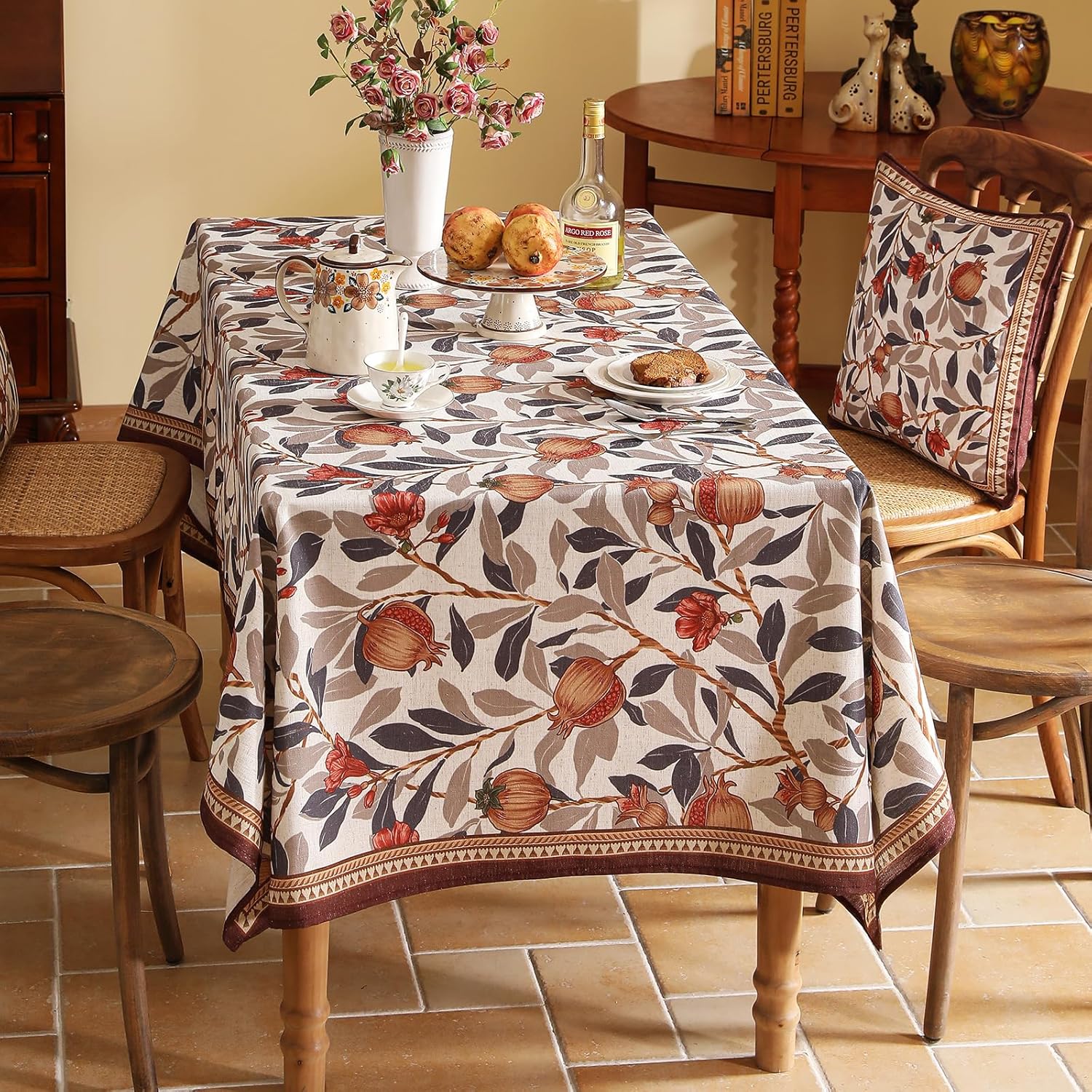 patdrea Designer Vintage Long Tablecloth for Rectangle Table,Linen Pomegranates Leaves Pattern Tablecloths,Decor Table Cover for Kitchen Dining Christmas,Party,Thanksgiving,63"x102"-Tehran a