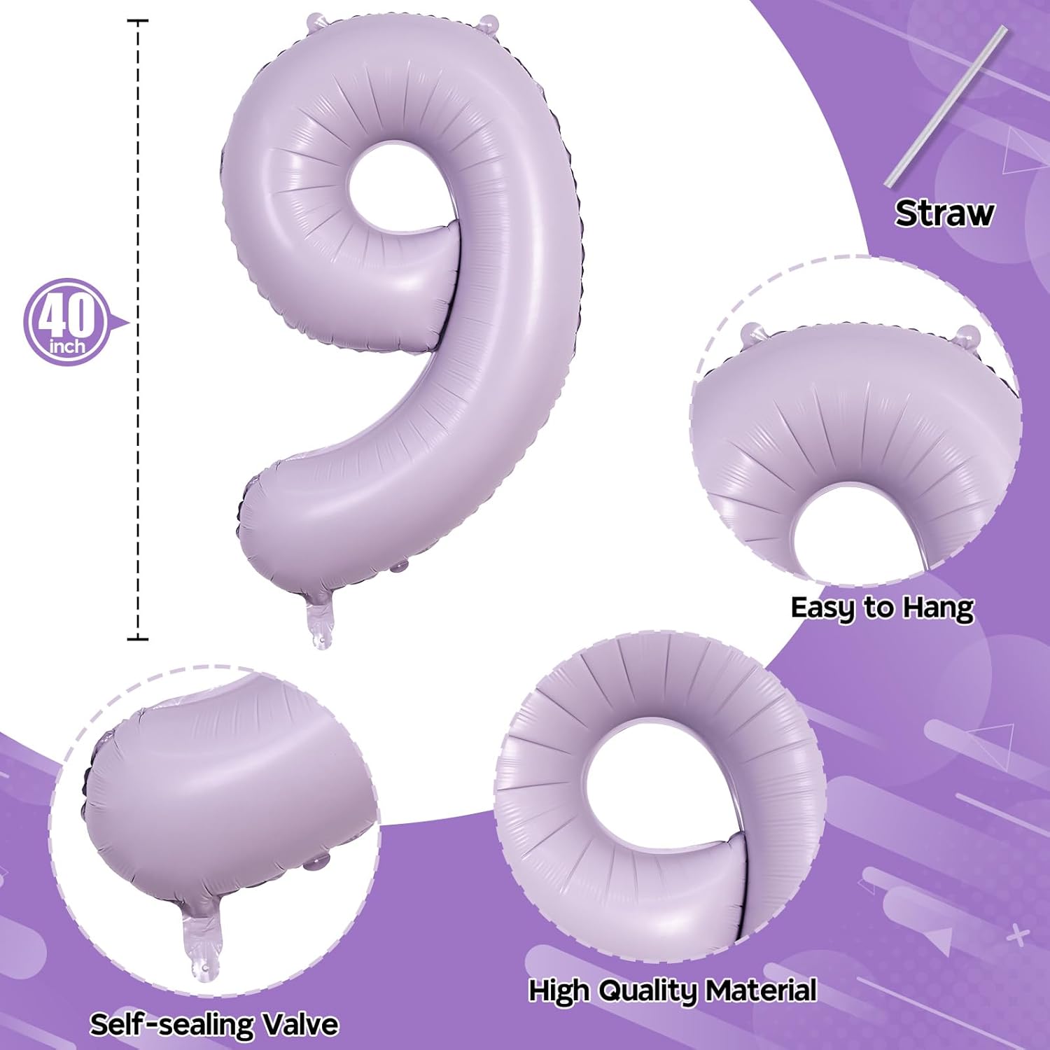 • πŸ’• Pastel Purple Number 9 Balloon πŸ’• - You will get 1pc 40 inch light purple mylar foil number 9 balloon and 1pc straw. Perfect for 9th 19th 29th 90th birthday or anniversary party decorations supplies.