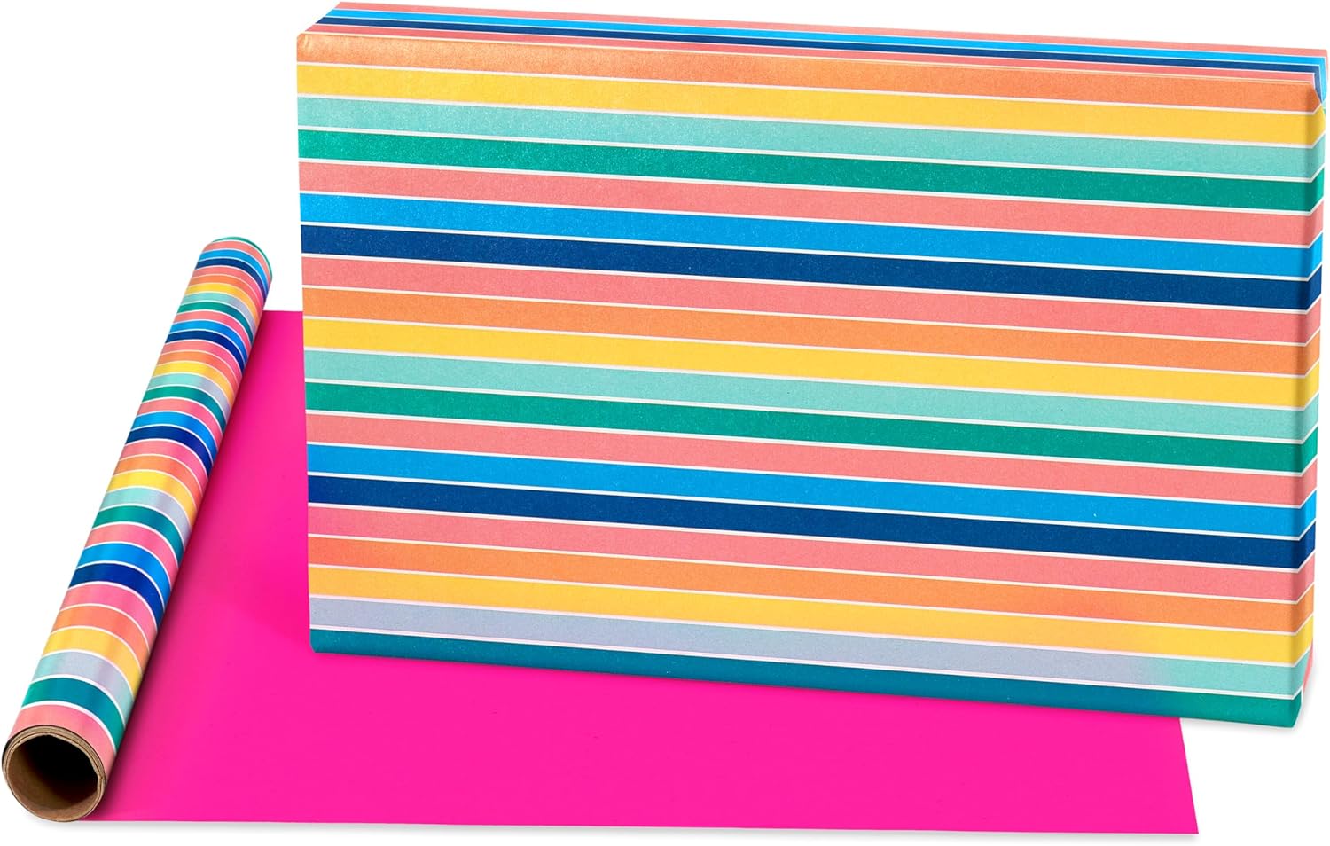 • This reversible multi-roll wrapping paper set features a bright assortment of colors including a gradient blue, solid bright pink and blue, and fun patterns of rainbow stripes, light blue diagonal stripes, mini rainbows, colorful polka dots, and bold lettering of the word, "Happy" printed on metallic foil for extra shine.