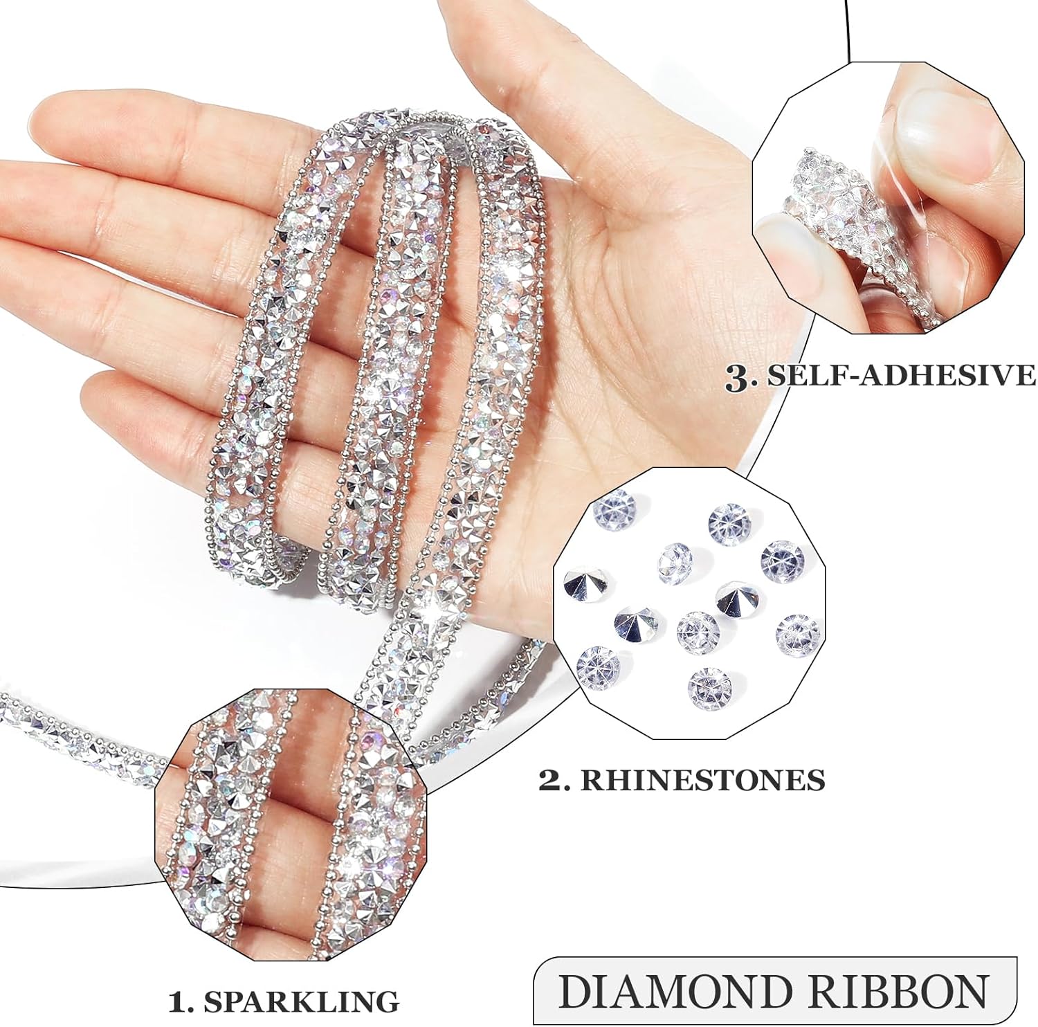 • Silver AB Rhinestone Ribbon: 1 roll of self-adhesive rhinestone ribbon Sticker, approx 3 yards in length, 1cm/0.4inch in width. (PACKAGE CONTENT)