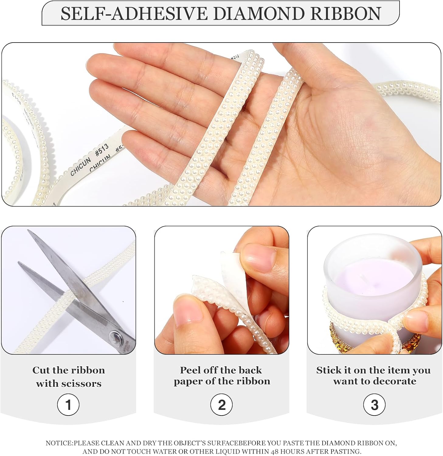 • NOTICE: 1. Please clean and dry the object's surface before you paste the pearls ribbon on, and do not touch water or other liquid within 48 hours after pasting,2. Please open this outside and air them out for a while! because the odor from production is trapped in shipping. Please give it time to let the smell go.