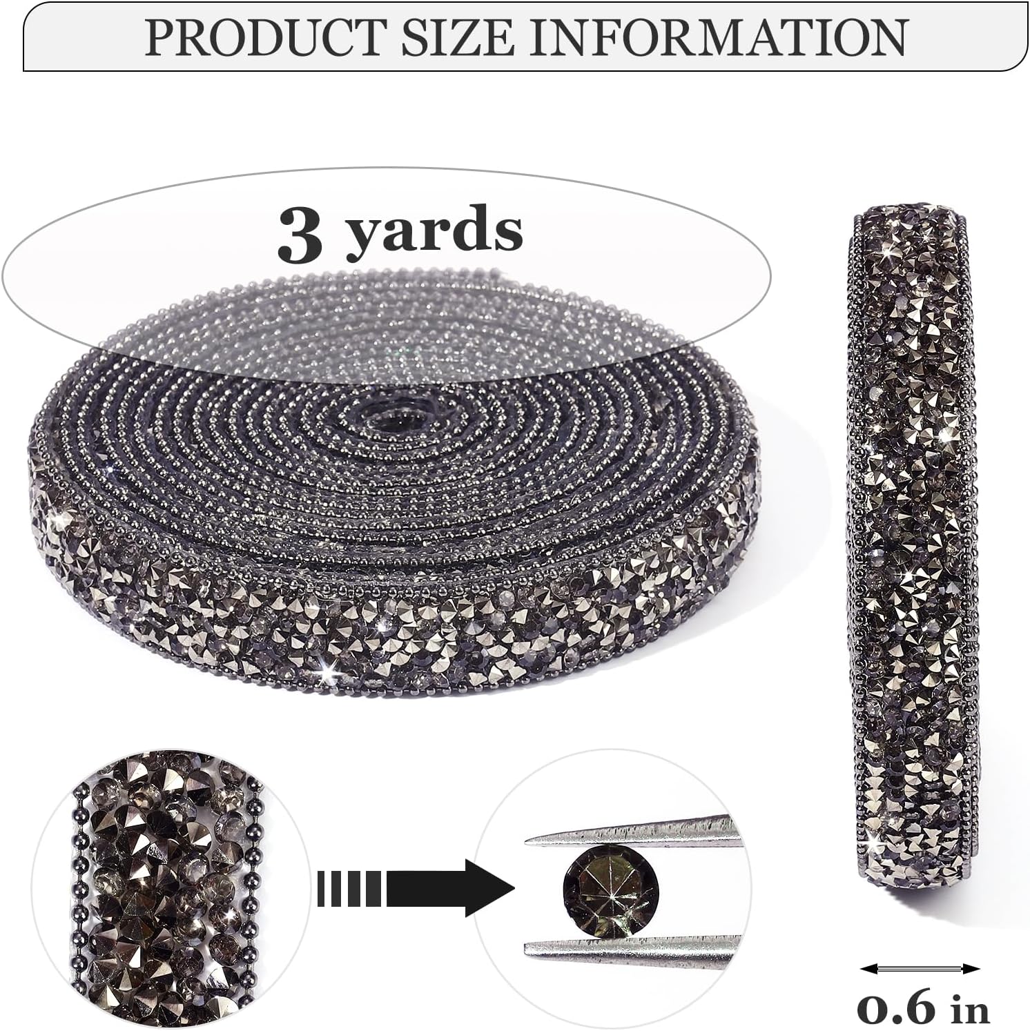 Rhinestone Ribbon 3 Yards Self Adhesive Rhinestone Strips Diamond Ribbon Sticker Crystal Roll Glitter Bling Rhinestones Tape for Crafting DIY Art Decoration (Jet Hematite,0.6 Inch)