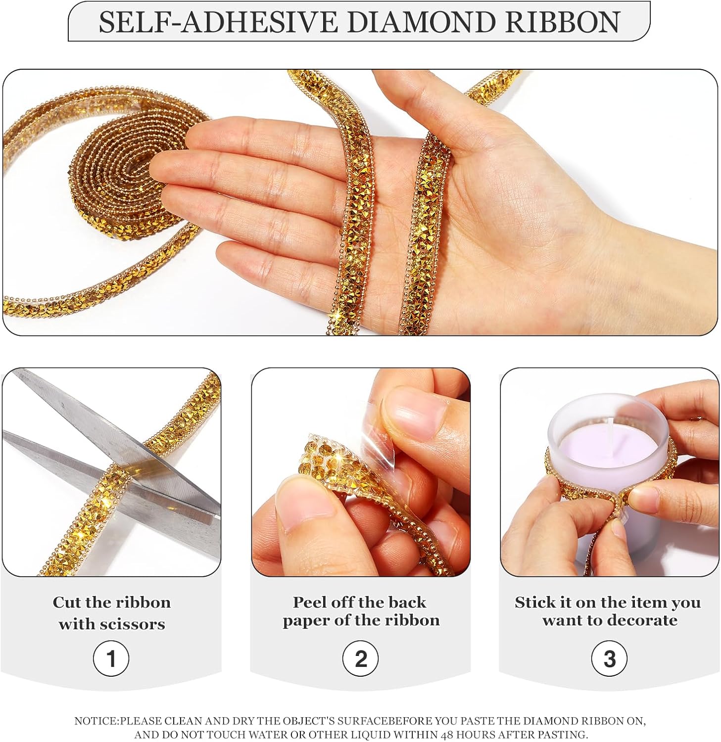 • Self-Adhesive Diamond Ribbon: The self-adhesive design with backing glue makes it possible to stick anywhere as long as the surface is smooth and clean. You cut the rhinestone ribbon into different lengths with scissors, then peel off the back paper of the sticker and paste it on the project you want to decorate.