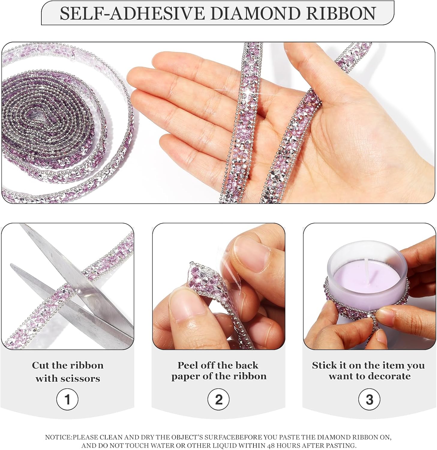 • Self-Adhesive Diamond Ribbon: The self-adhesive design with backing glue makes it possible to stick anywhere as long as the surface is smooth and clean. You cut the rhinestone ribbon into different lengths with scissors, then peel off the back paper of the sticker and paste it on the project you want to decorate.