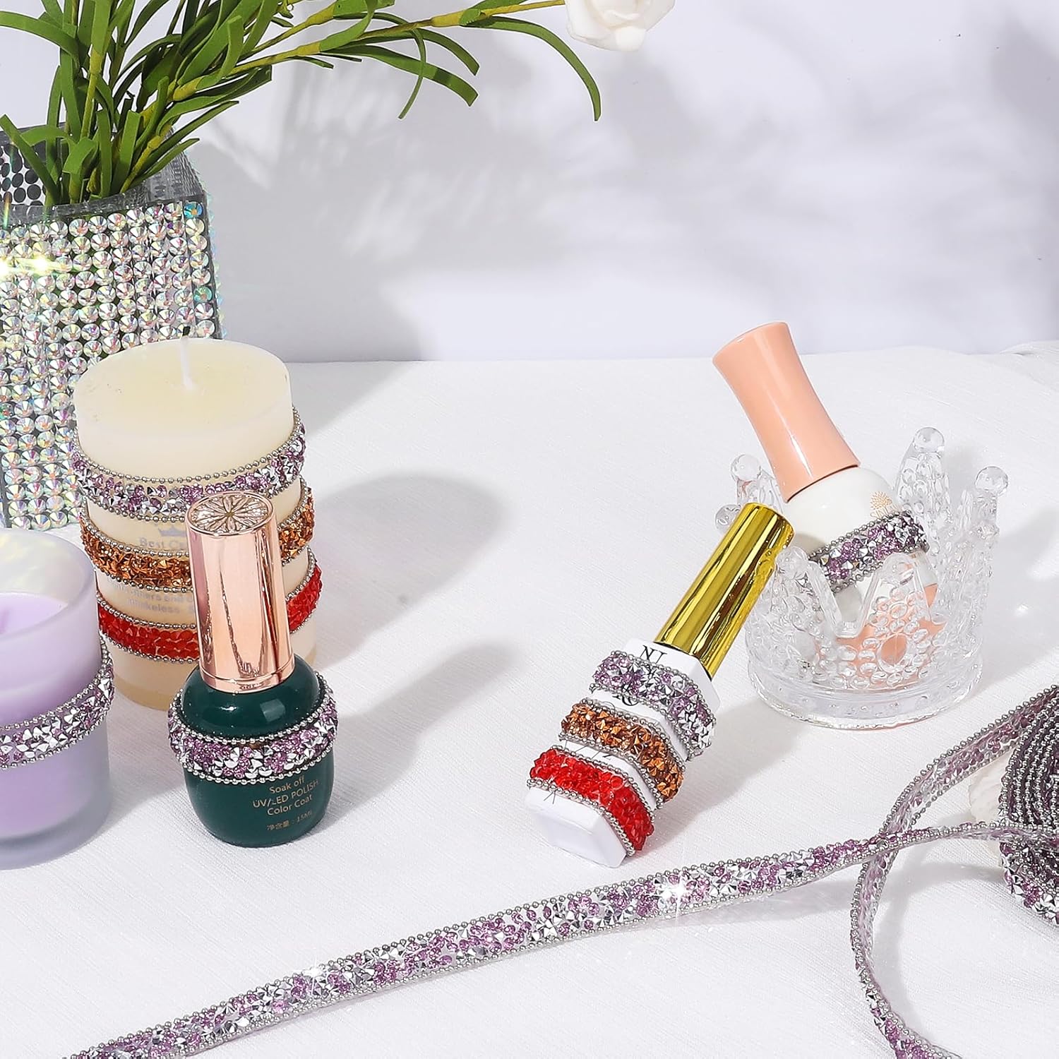 • Wide Applications: The bling rhinestone sticker strip is suitable for many DIY decorations, mirrors, candles, vases, photo frames, costumes, home decor, offices, gardens, cars, personalized phone cases, jewelry boxes, and other places.