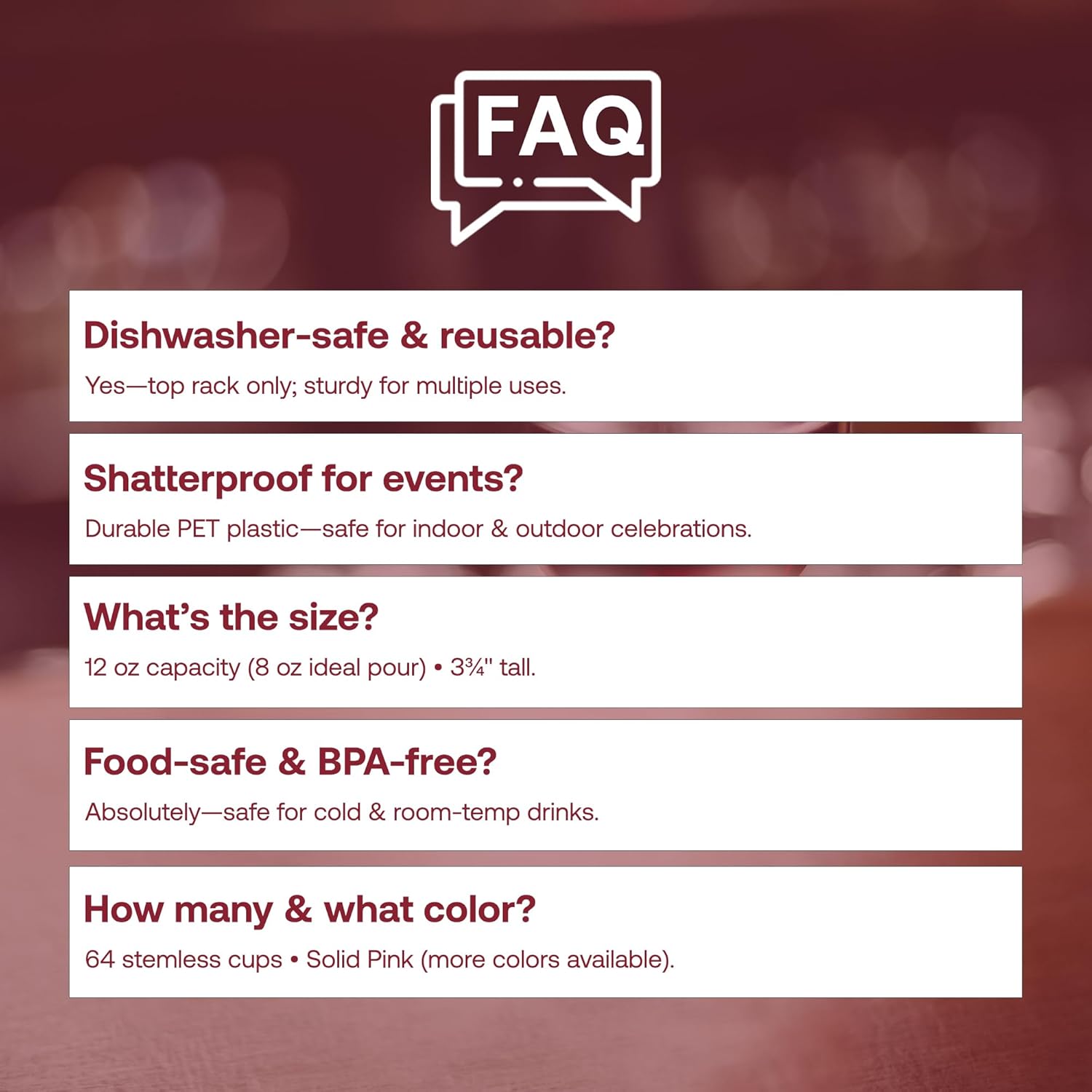 • BULK PACK FOR LARGE CELEBRATIONS – With 64 plastic stemless wine glasses, this bulk set ensures you have enough elegant drinkware for large gatherings, giving every guest a stylish glass.