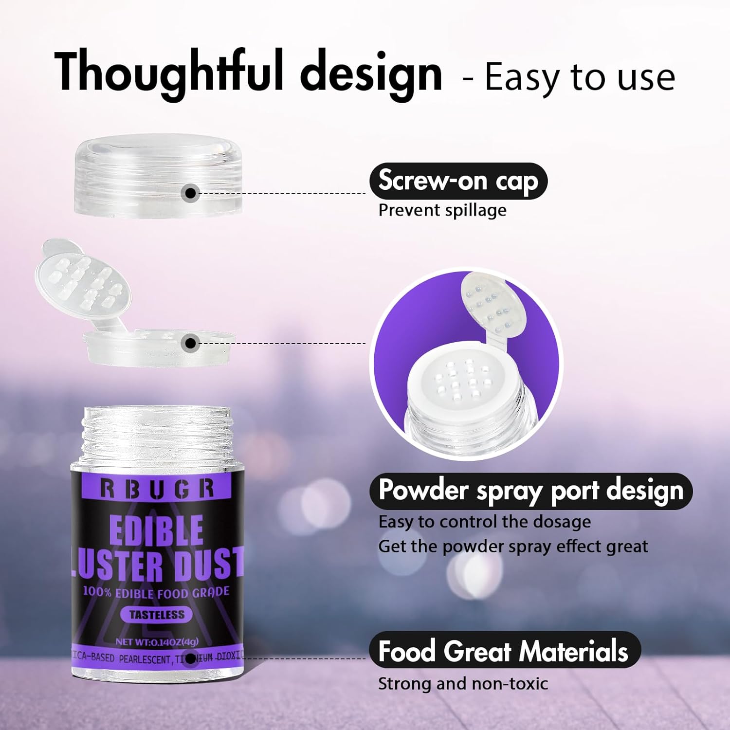 • You Get: The package contains 6 bottles of colourful glitter for drinks: Coral Blue Peacock Green/Lavender Purple/Lemon Yellow/Carrot orange/Ruby Red. 4g/0.14oz of pigment powder per bottle and each bottle of luster dust edible set has an individual inner cork sealing lid with evenly distributed holes, a thoughtful design that allows for a more even spreading of the powder and also prevents excess powder from spilling out. The powder glitter is very delicate and easy to stir up