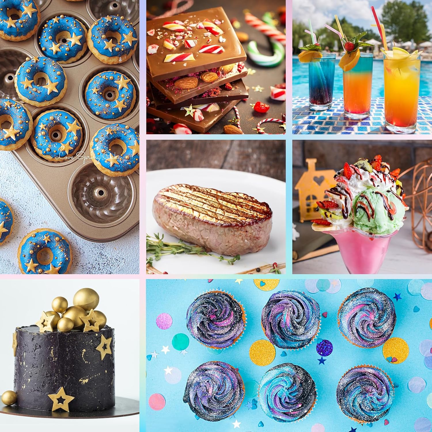• Various Ways of Use: You can mix the luster dust directly with vodka, cocktails and other beverages to make sparkling starlight drinks; you can dip a brush into the pigment powder and apply it evenly on candy popsicles to make lovely patterns; you can apply the edible glitter directly on chocolate grinders to make dazzling chocolates; and you can sprinkle the glitter drink on cupcakes to make beautiful cakes in all colours, etc
