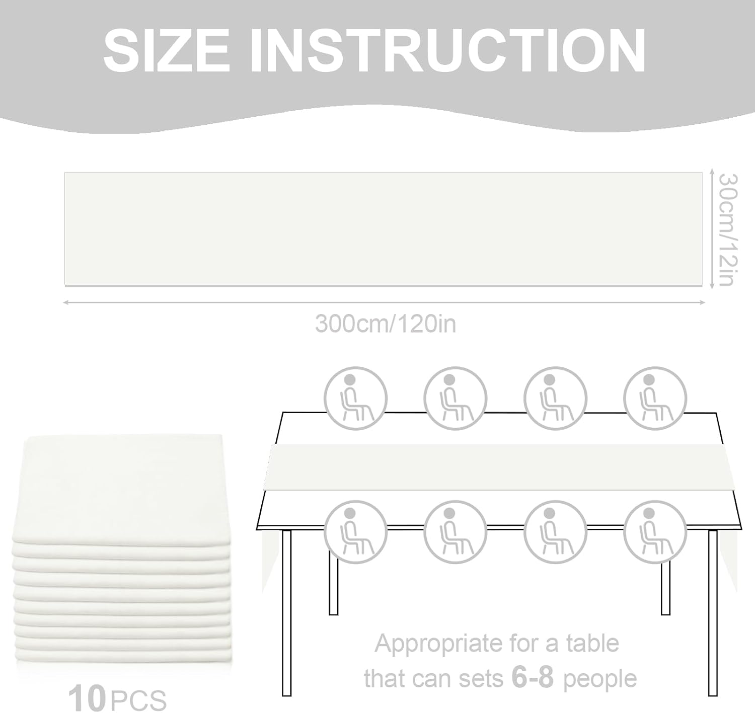 • PACKAGE CONTENTS:You will get 10 pieces of chiffon tablecloths, single tablecloth size: 30 x 300cm/12 x 120in. Each tablecloth is equipped with 2 white ribbons, which can be used to tie the sides to fix, the quantity is enough for wedding banquet and various parties, our tablecloths are suitable for tables with 6-8 seats