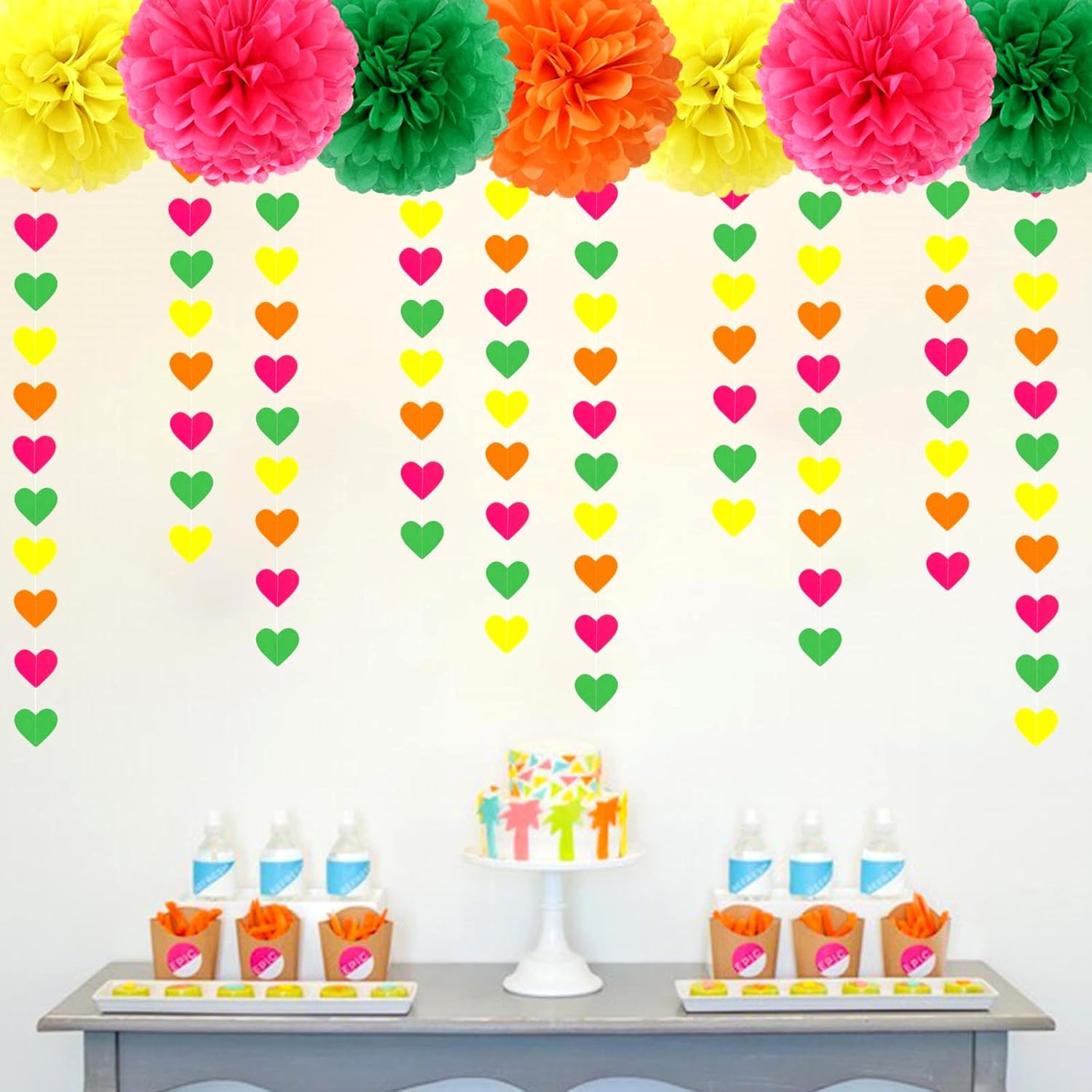 • 【Material】The material is eco-friendly neon paper in yellow,orange,green, hot pink color.You can cut to any length you want if you need shorter length.The hearts are cut very neatly.