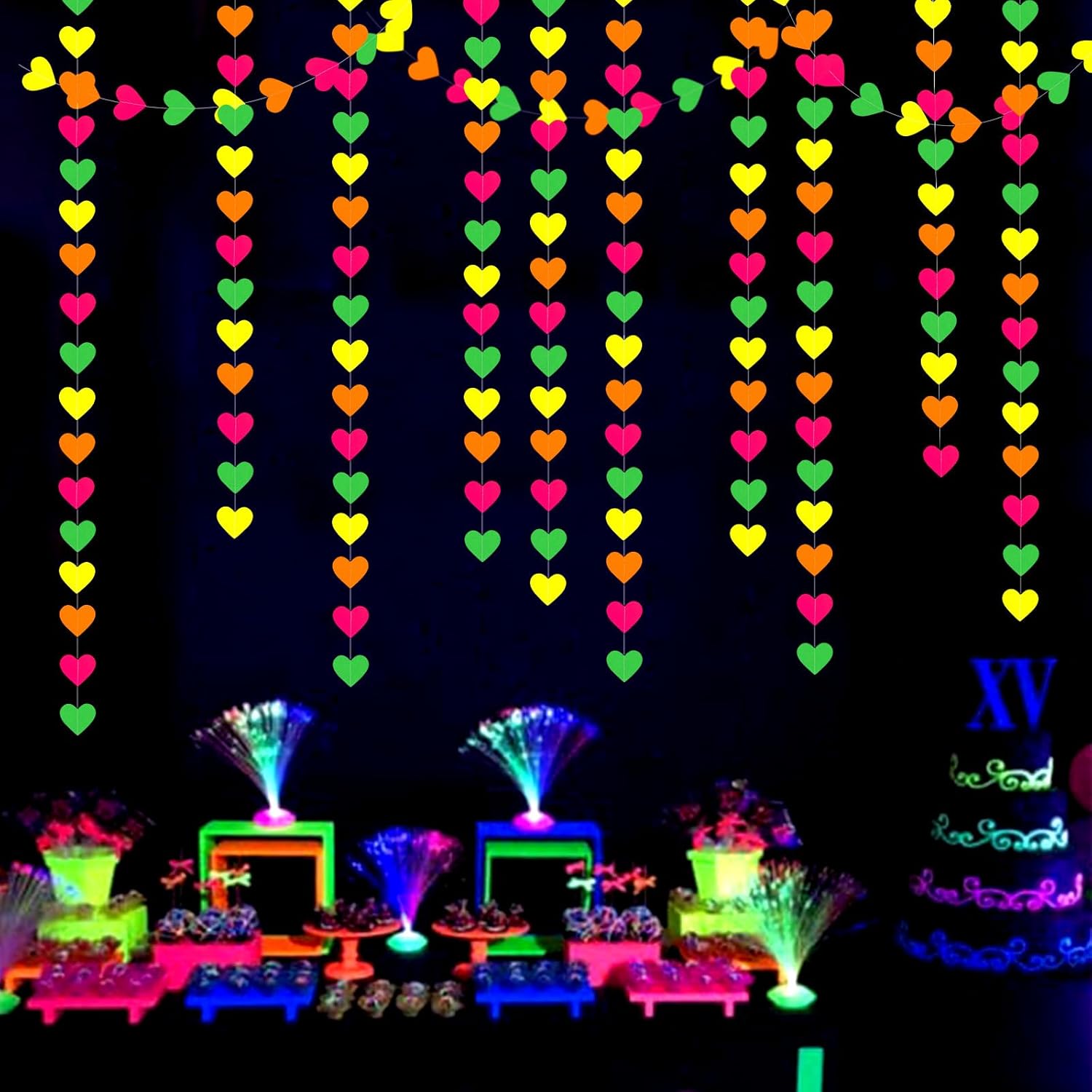 UV Neon Party Decorations Heart-Garland - 52ft Glow in The Dark Supplies,80s Hanging Streamers Banner,Girl Romantic Wedding Anniversary Baby Bridal Shower Engagement Decor Panduola