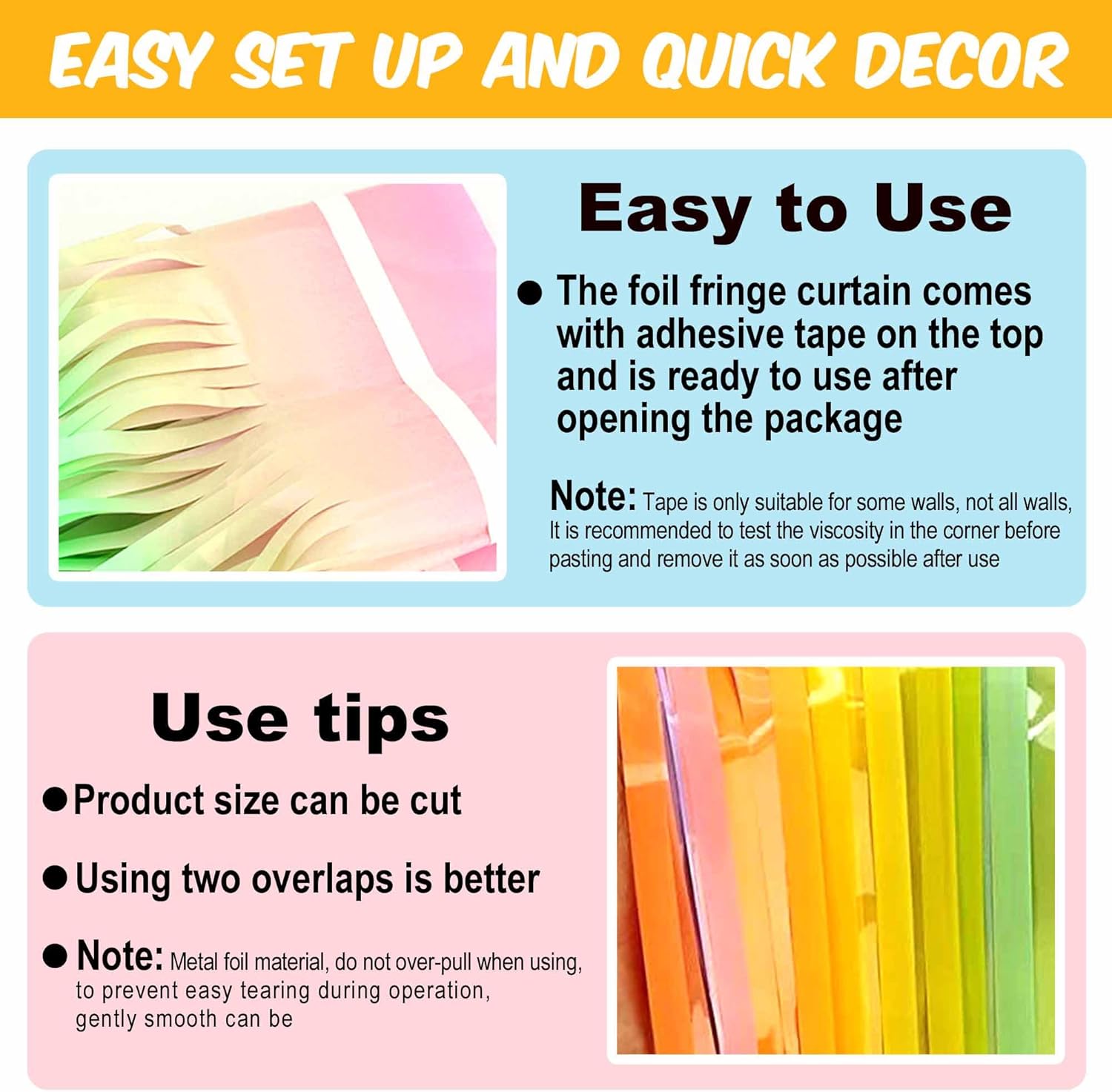 • Easy to Use: The tinsel foil fringe streamers curtain backdrop comes with double sided tape on the top, gently peel plastic strip off and it would be very easy to paste on smooth surfaces such as wall, window, table, door or anywhere you like