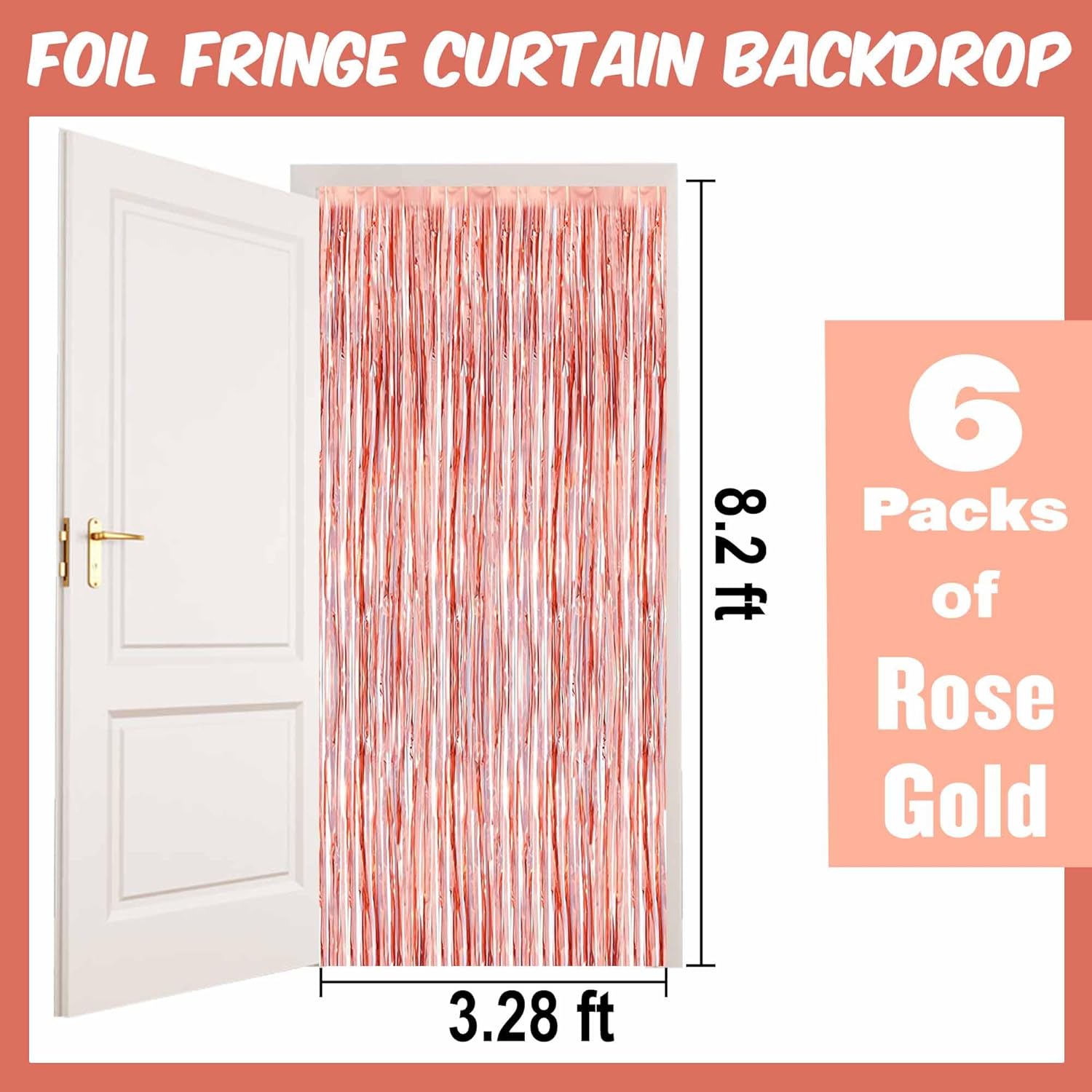 • Package and size: 6 Packs Foil Fringe Streamers Curtain Backdrop. The size is 3.28 x 8.2 feet. It's long, enough to fit any party occasion. Made of metallic foil material, shiny and creating dazzling effects, adding luxury and visual impact to the party