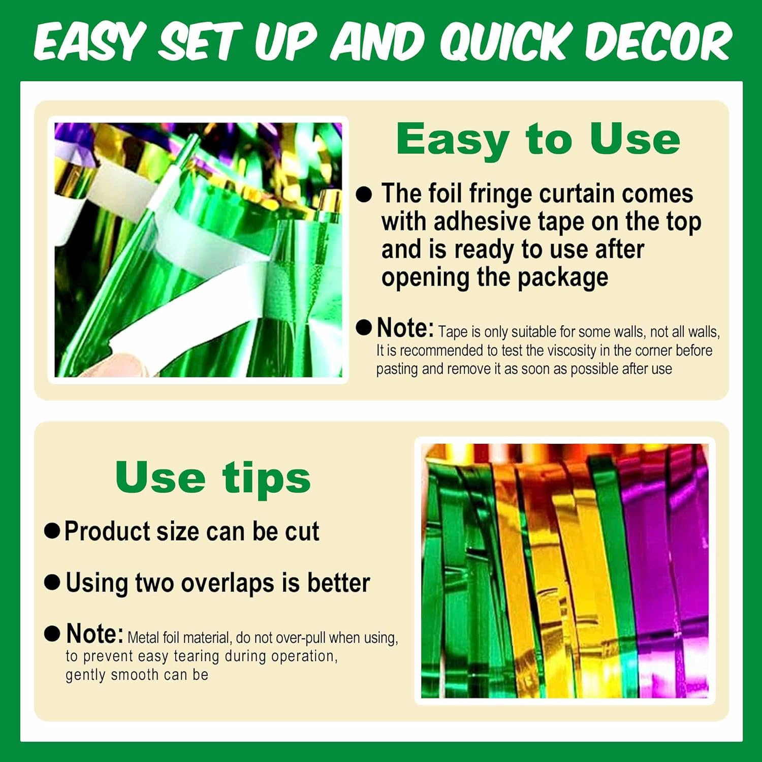 • Easy to Use: The tinsel foil fringe streamers curtain backdrop comes with double sided tape on the top, gently peel plastic strip off and it would be very easy to paste on smooth surfaces such as wall, window, table, door or anywhere you like