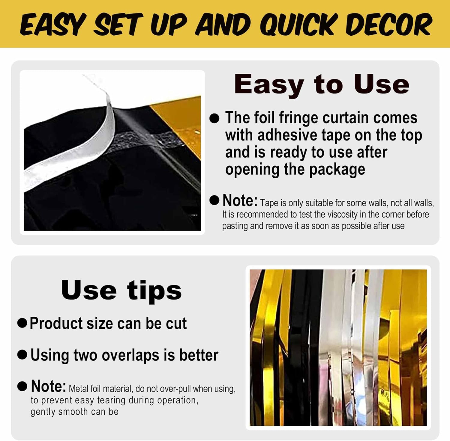• Package and size: 3 Packs Foil Fringe Streamers Curtain Backdrop. The size is 3.28 x 9.8 feet. It's long, enough to fit any party occasion. Made of metallic foil material, shiny and creating dazzling effects, adding luxury and visual impact to the party
