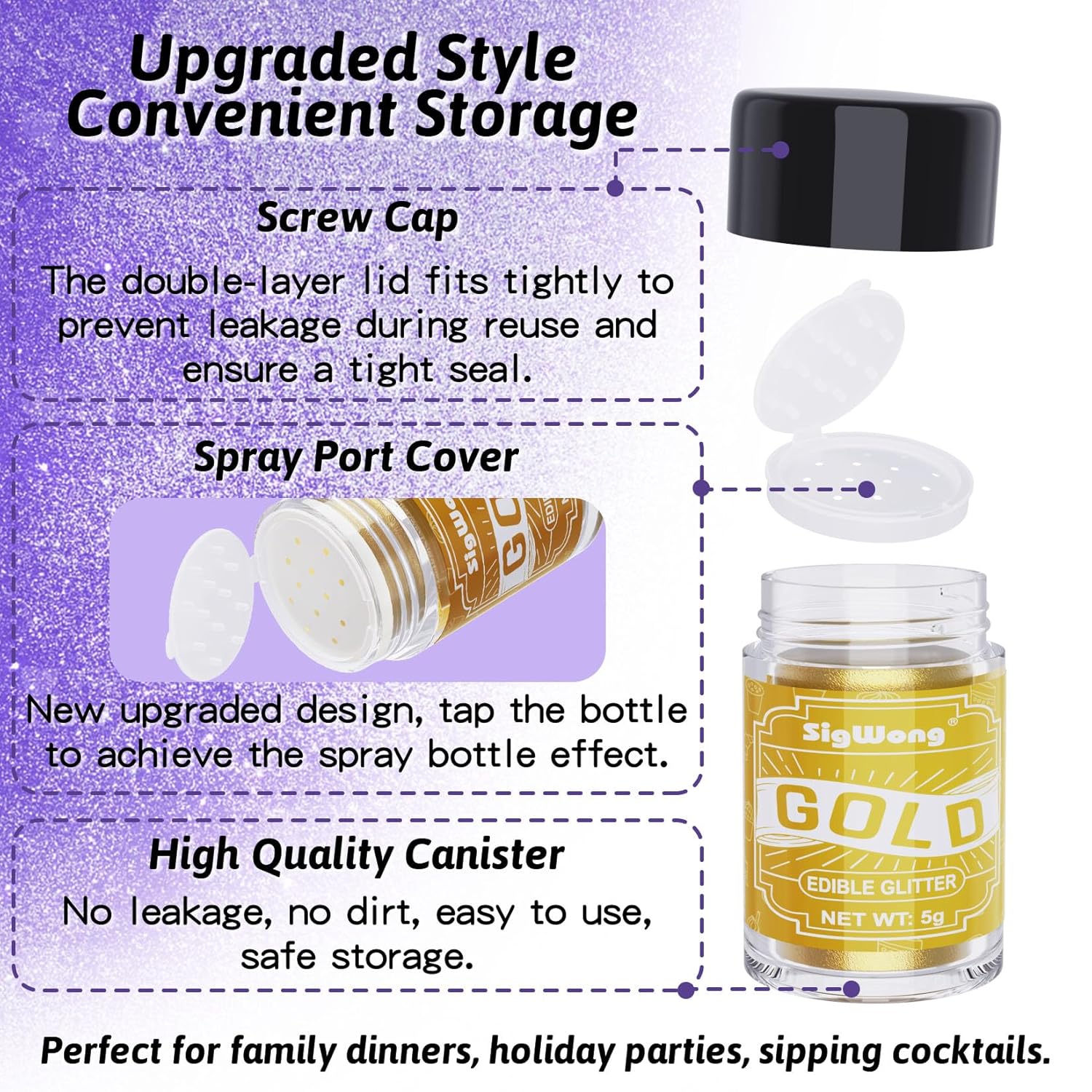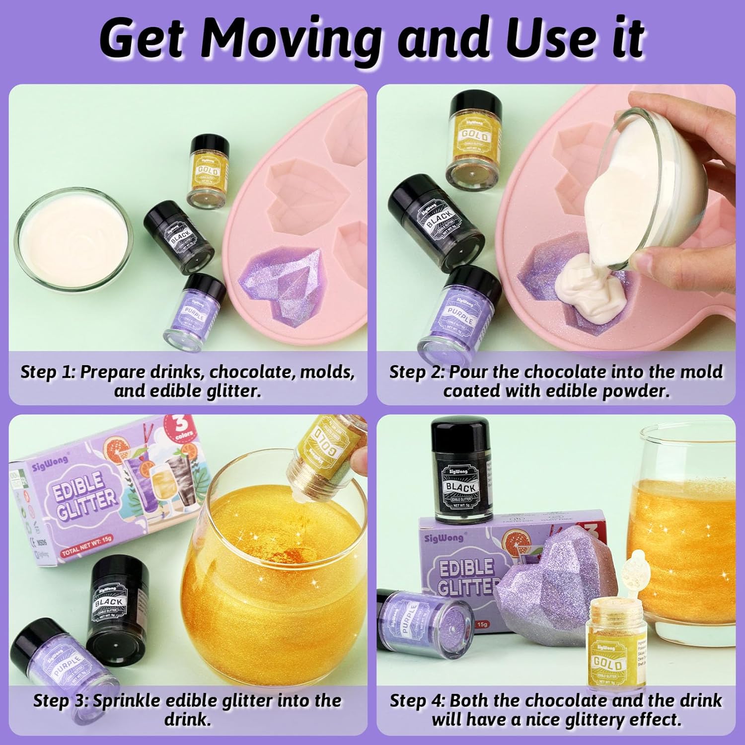 • Edible Glitter Set - 3 colors edible glitter for drinks ( purple, black, gold ). 100% edible food-grade glitter powder in 0.18 oz/5 g size to meet your needs in breweries, distilleries, restaurants and food service industry.