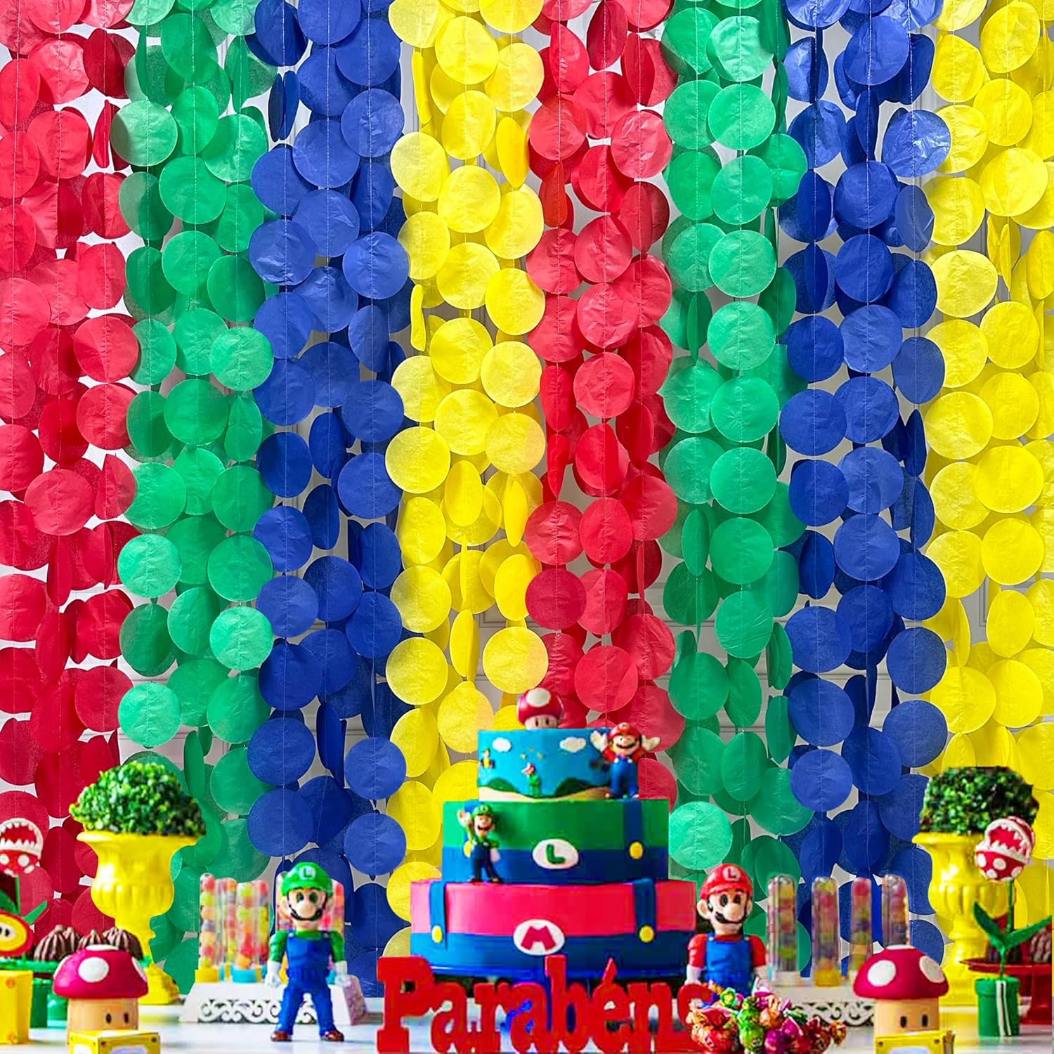 205Ft Super Mario Party Decorations Red Green Blue Yellow Big Polka Dot Tissue Paper Backdrop Streamer Circle Dot Hanging Garland for Birthday Baby Shower Carnival Circus Clown Fiesta Colorful Party