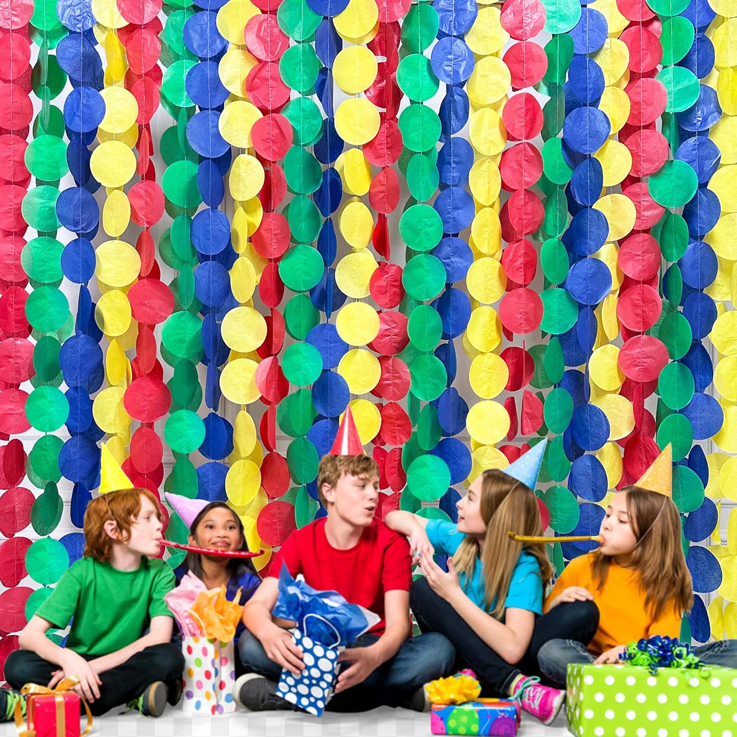 • 🟢ENVIRONMENTAL MATERIAL-Our red yellow green blue big circle dot streamer garland are made of high quality tissue paper,carefully hand-made and machine-sewn together with thread.durable and reusable.Unroll & unwrap the tissue paper garland carefully. Due to delicate nature of thread, may tangle.