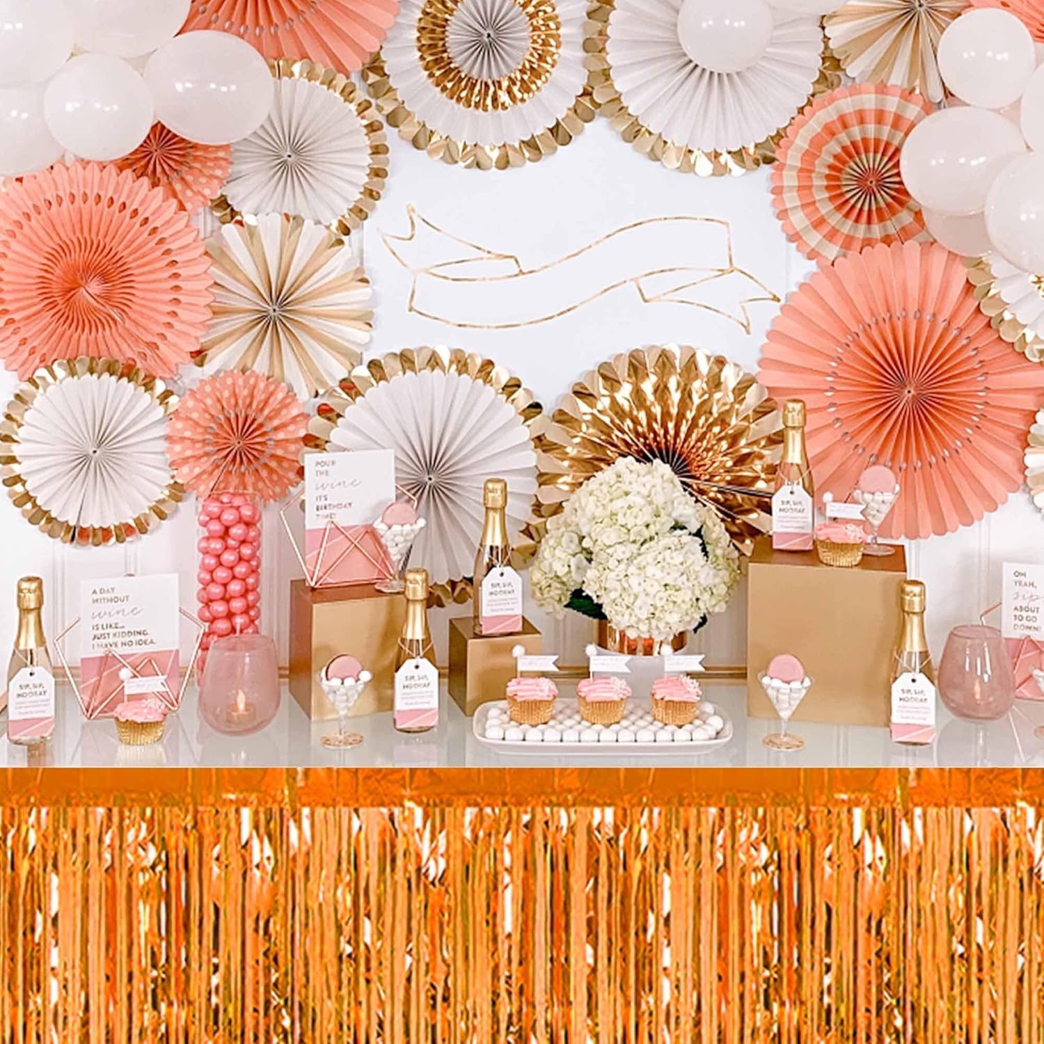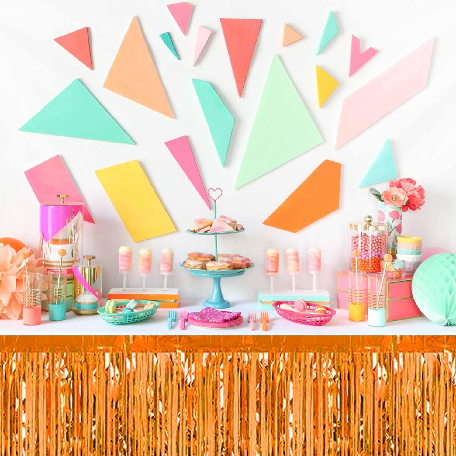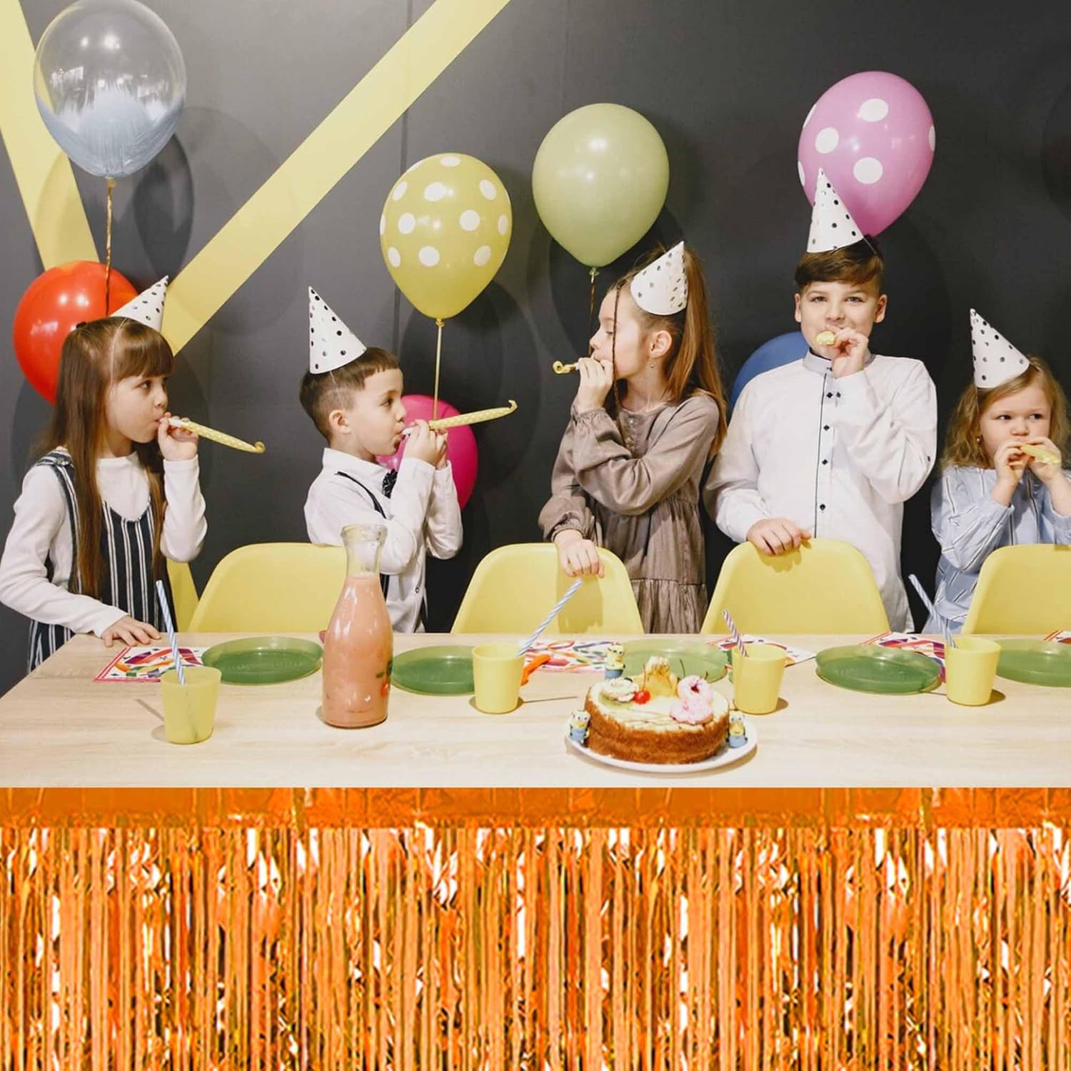 3 Pack Orange Foil Fringe Table Skirts Metallic Tinsel Streamers Garland Banner Backdrop for Table Decor, Parade Float, Birthday, Wedding, Halloween, Christmas Party Decorations(29x108 In)
