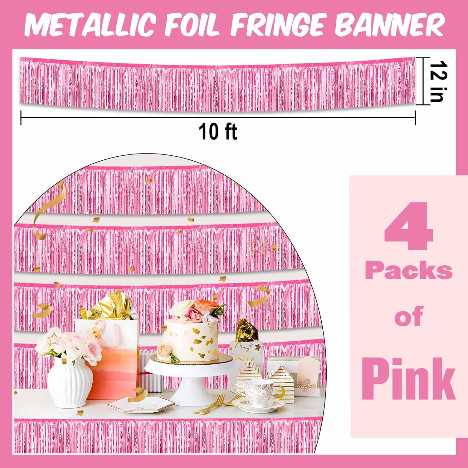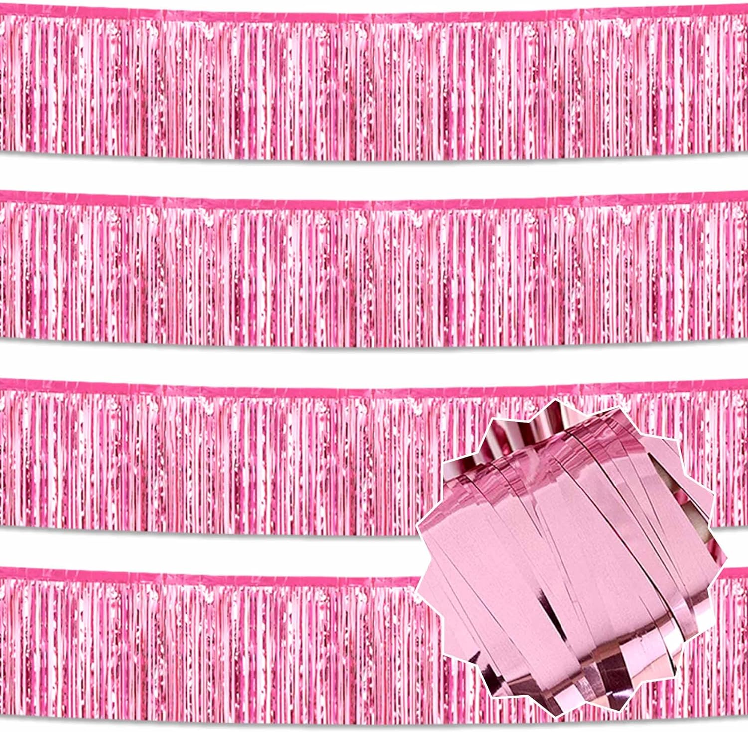 4 Pack 10 Ft Pink Foil Fringe Garland Metallic Streamers Tinsel Banner Wall Hanging Garland Backdrop for Parade Floats, Halloween, Christmas, Thanksgiving, New Year Party Decorations