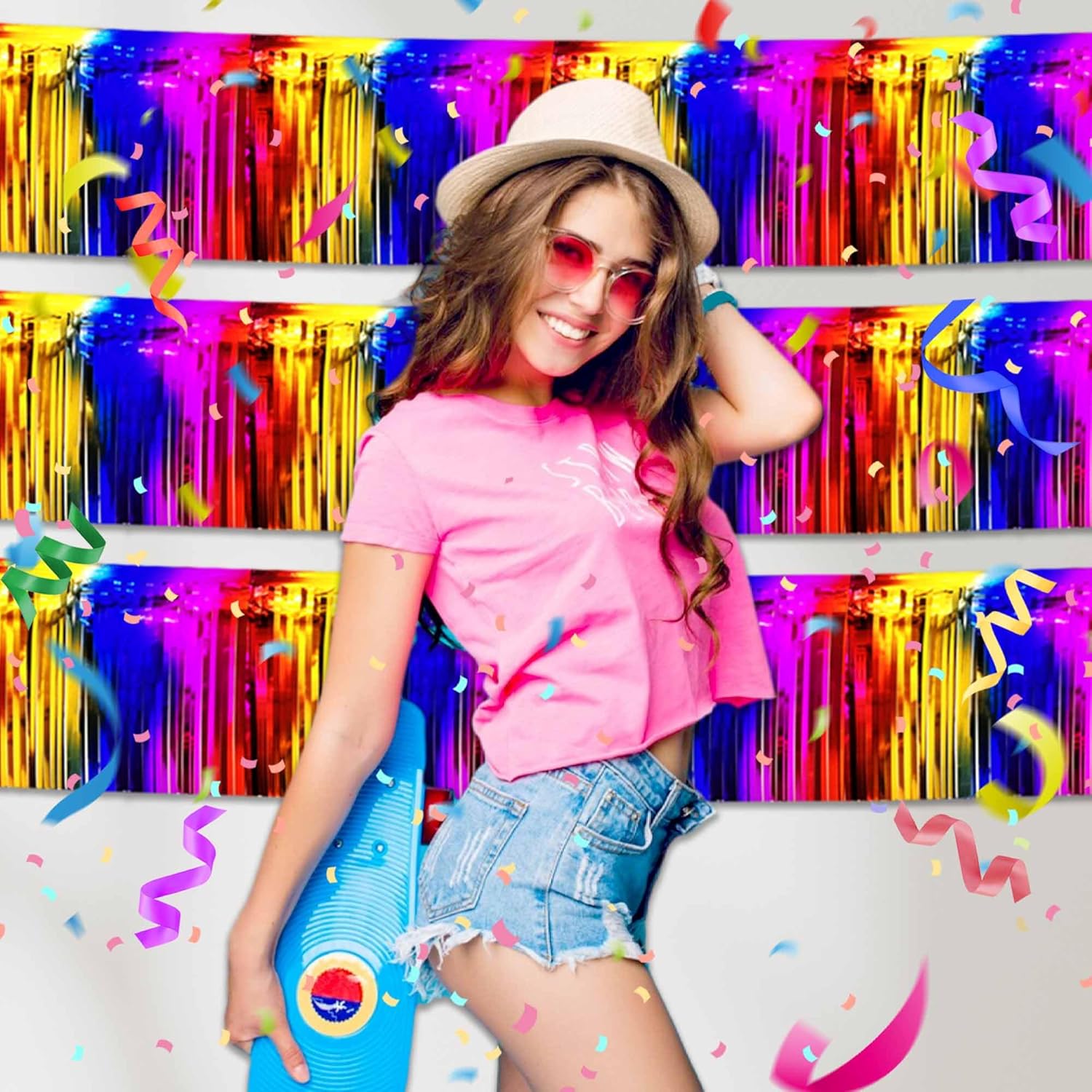 4 Pack 10 Ft Rainbow Foil Fringe Garland Metallic Streamers Tinsel Banner Wall Hanging Garland Backdrop for Parade Floats, Halloween, Christmas, Thanksgiving, New Year Party Decorations