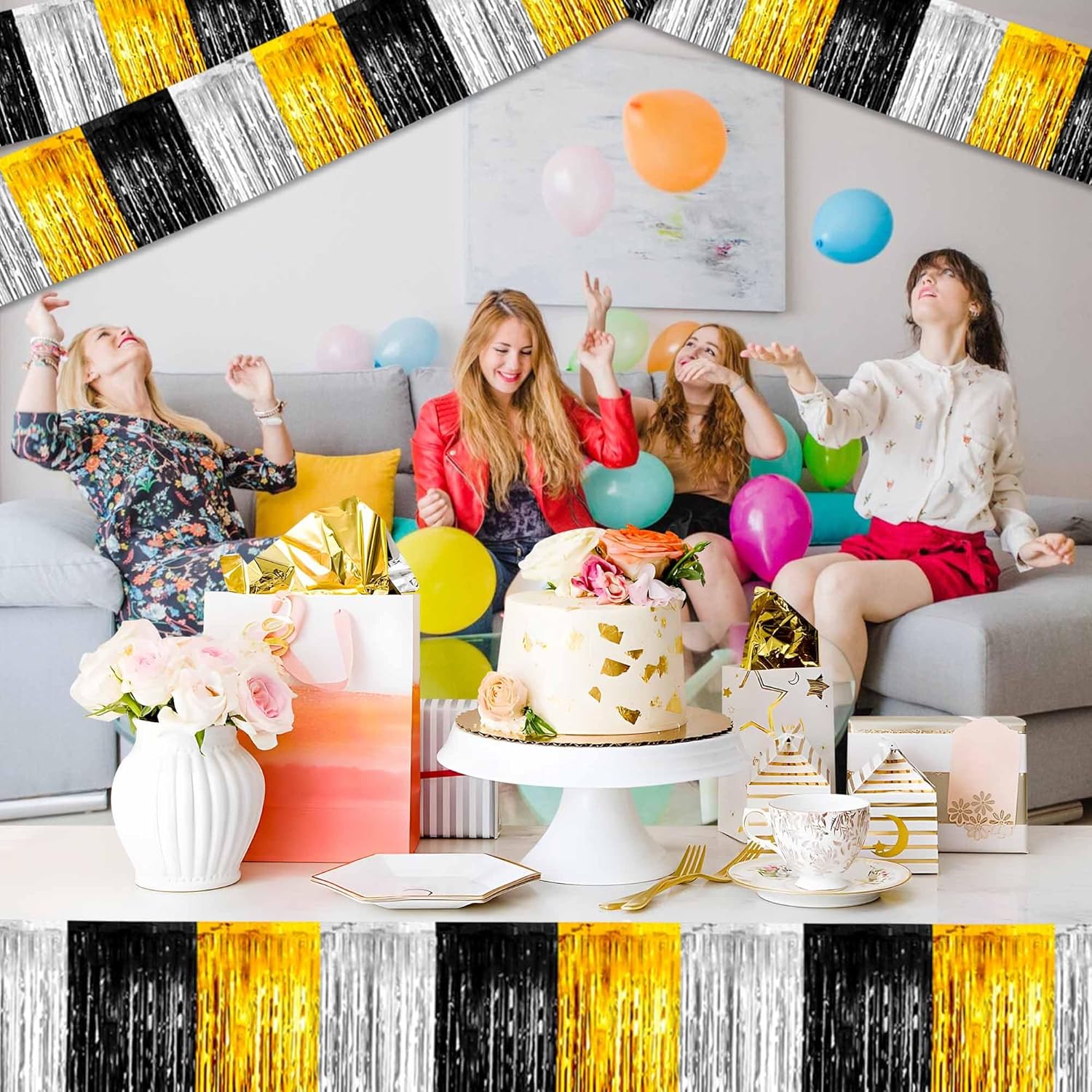 6 Pack 10 Ft Black Gold Silver Foil Fringe Garland Metallic Streamers Tinsel Banner Wall Hanging Garland Backdrop for Parade Floats, Halloween, Christmas, Thanksgiving, New Year Party Decorations