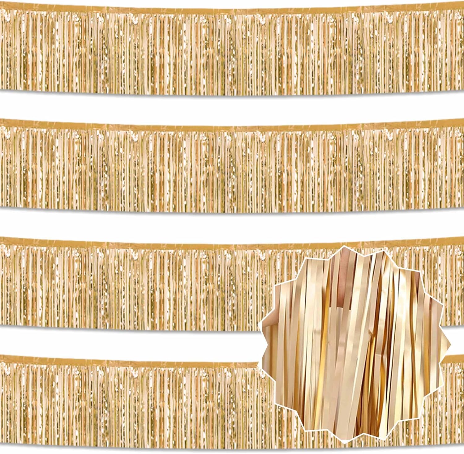 4 Pack 10 Ft Champagne Gold Foil Fringe Garland Metallic Streamers Tinsel Banner Wall Hanging Garland Backdrop for Parade Floats, Halloween, Christmas, Thanksgiving, New Year Party Decorations