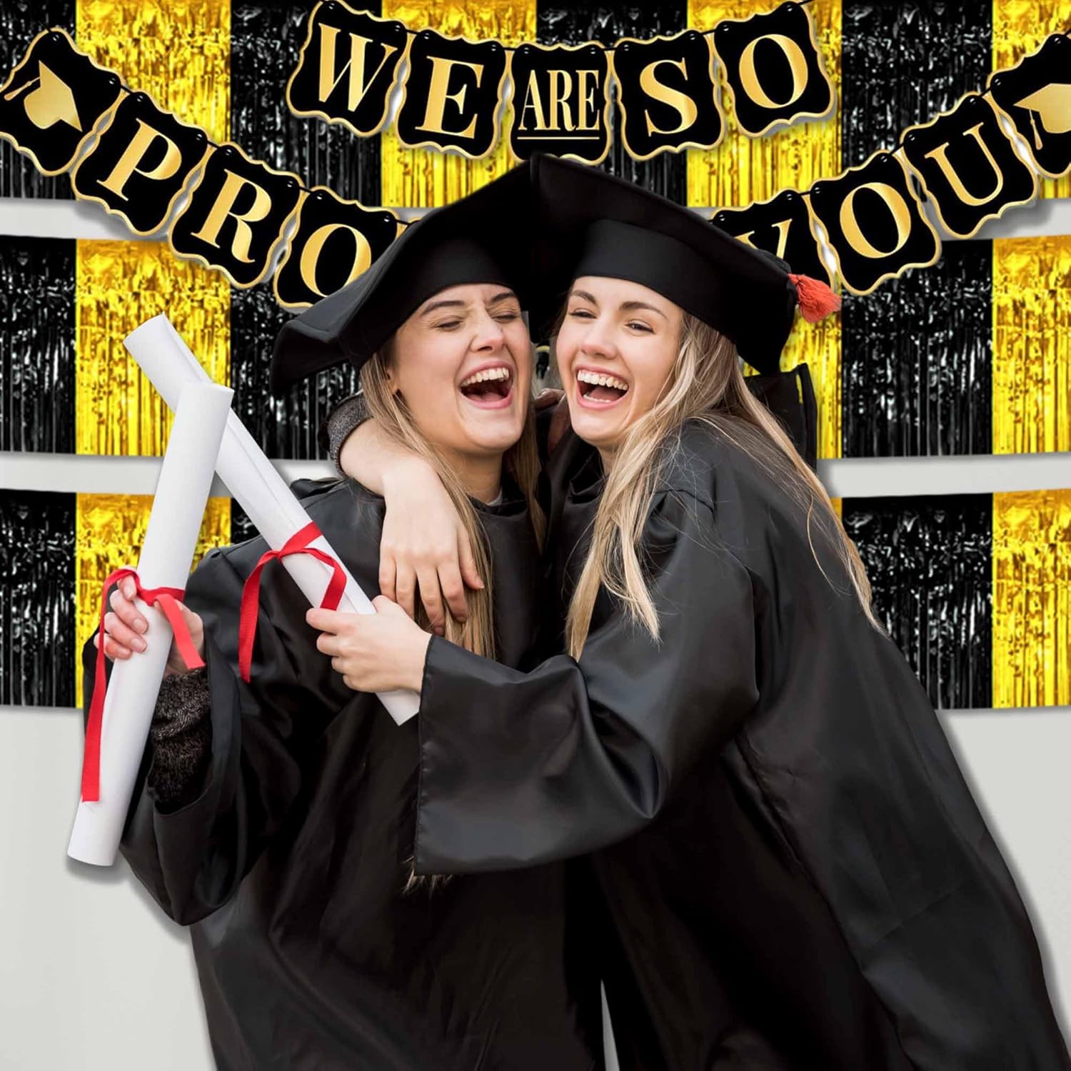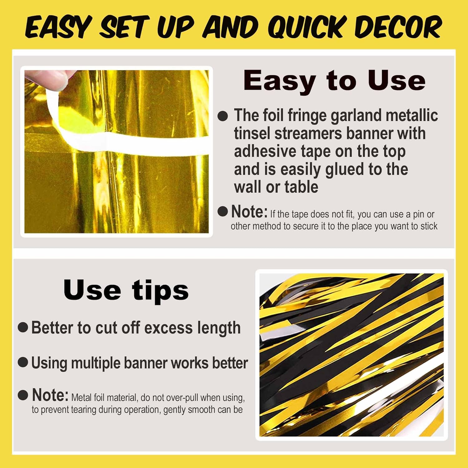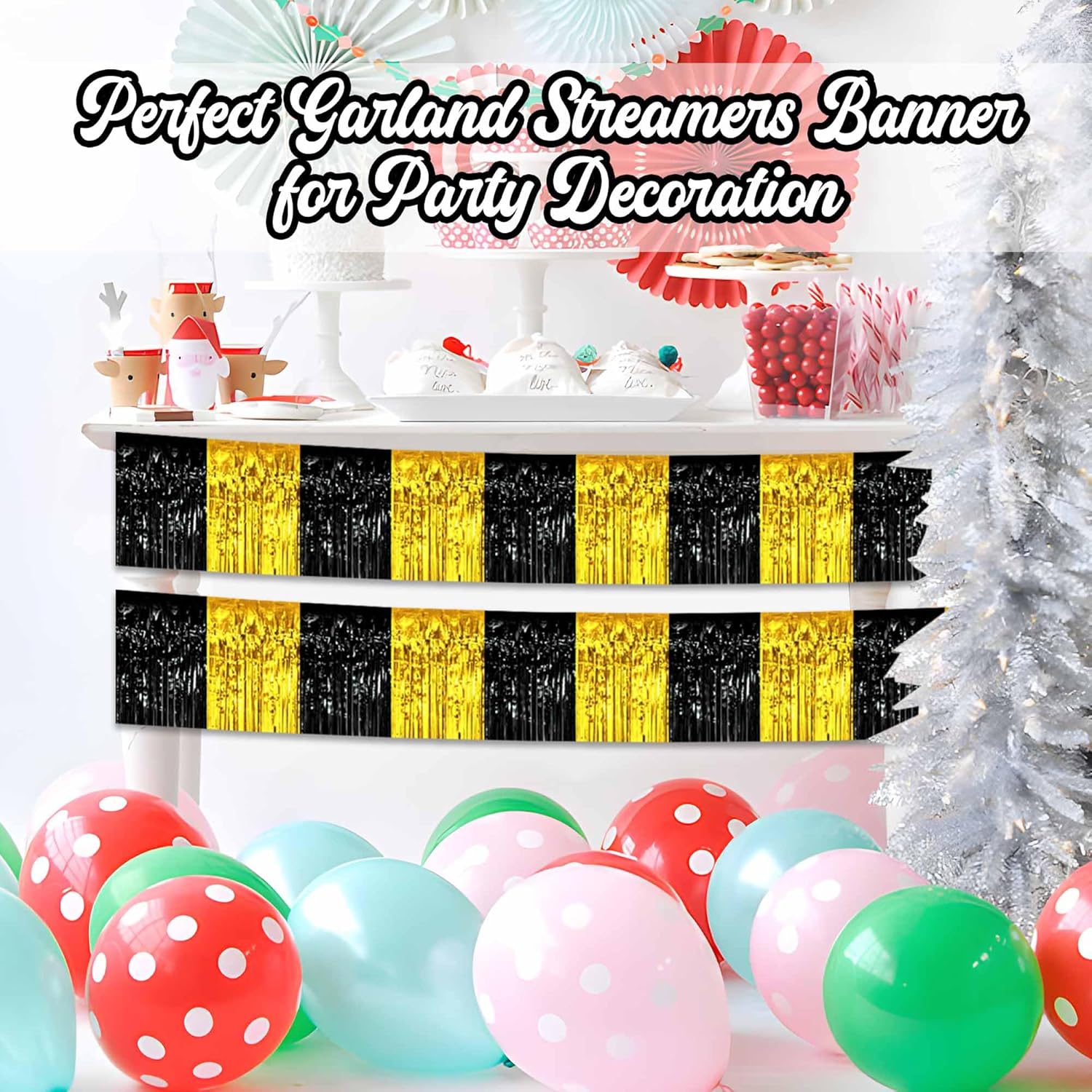 6 Pack 10 Ft Black and Gold Foil Fringe Garland Metallic Streamers Tinsel Banner Wall Hanging Garland Backdrop for Parade Floats, Halloween, Christmas, Thanksgiving, New Year Party Decorations
